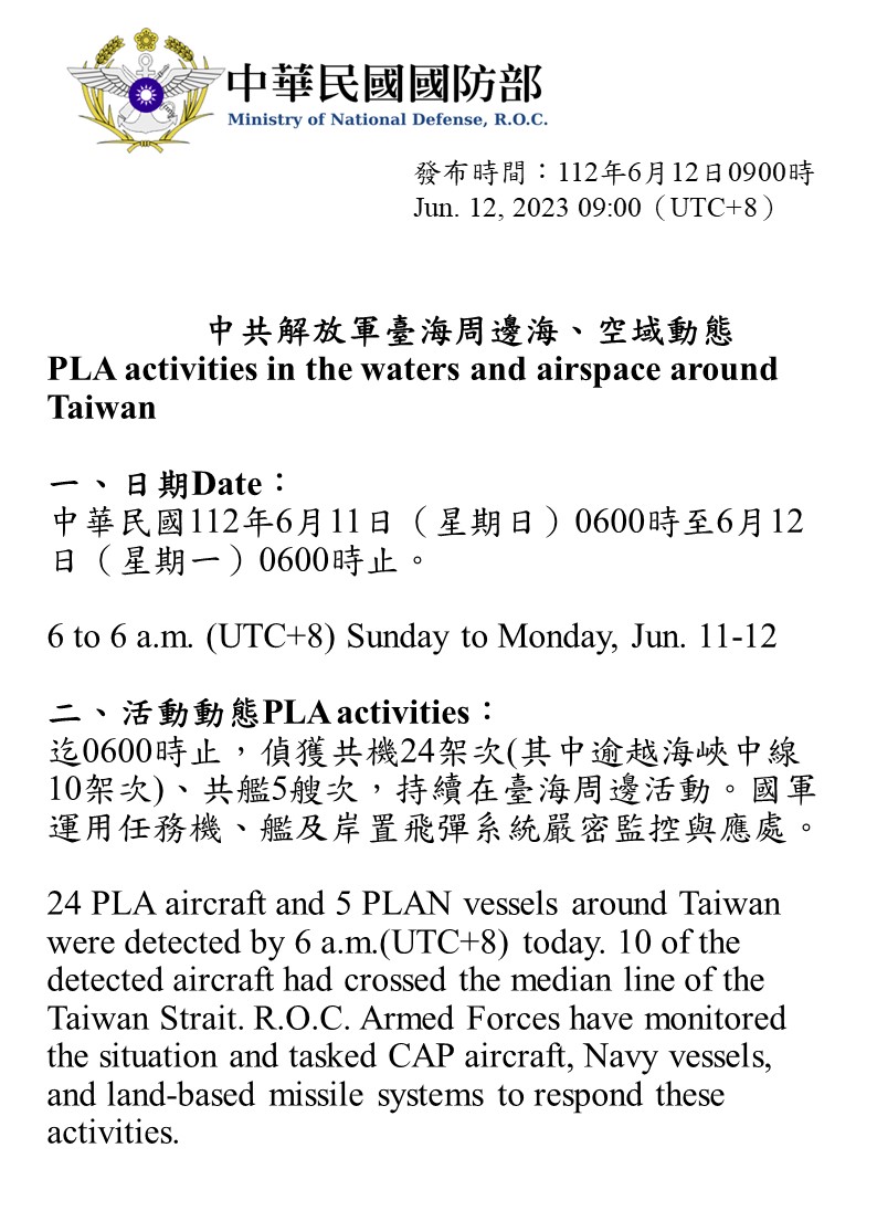 迄0600時止,偵獲共機24架次(其中逾越海峽中線10架次)、共艦5艘次,持續在臺海周邊活動。國軍運用任務機、艦及岸置飛彈系統嚴密監控與應處。