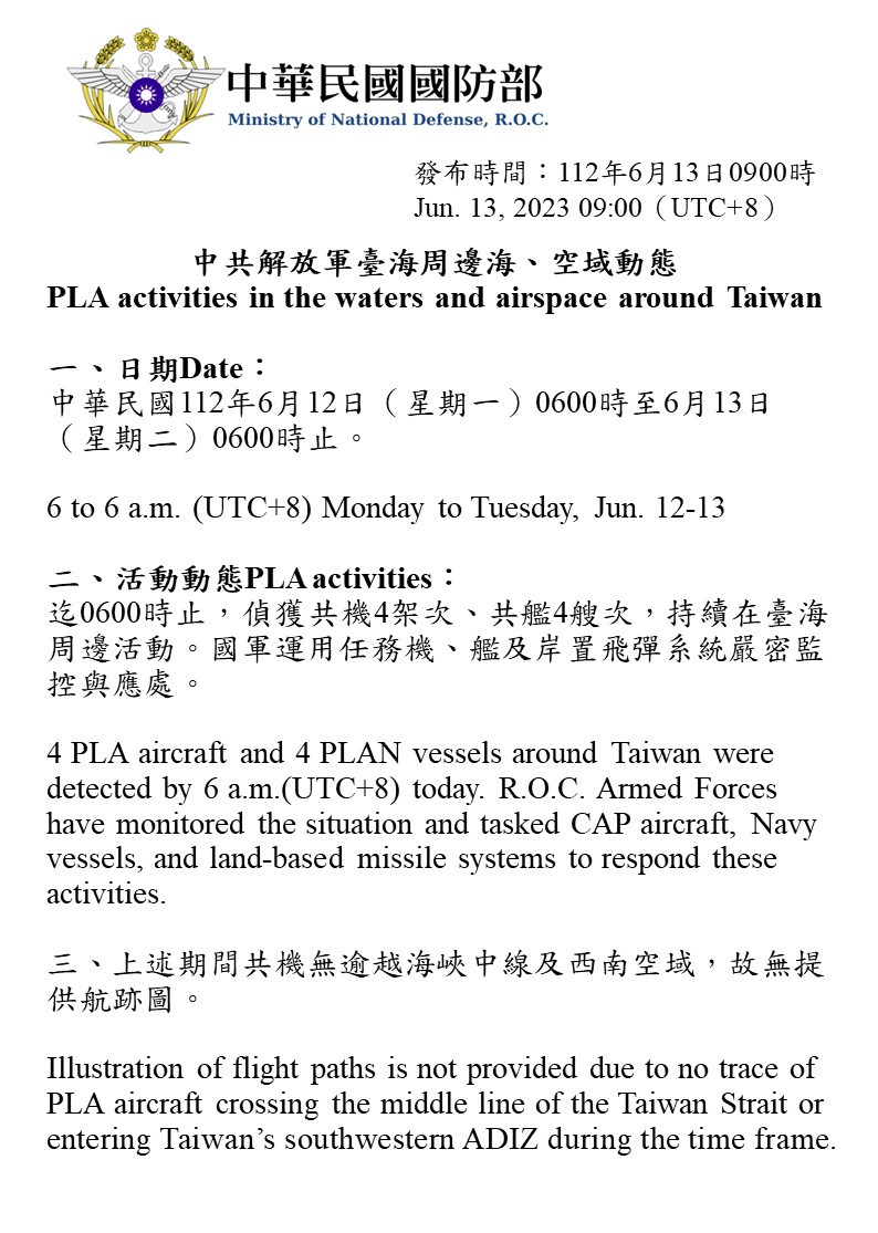 迄0600時止,偵獲共機4架次、共艦4艘次,持續在臺海周邊活動。國軍運用任務機、艦及岸置飛彈系統嚴密監控與應處。