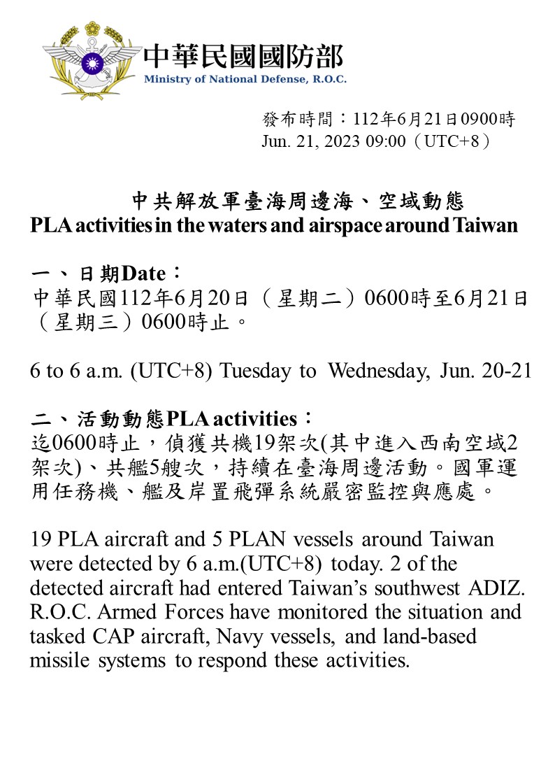 迄0600時止,偵獲共機19架次(其中進入西南空域2架次)、共艦5艘次,持續在臺海周邊活動。國軍運用任務機、艦及岸置飛彈系統嚴密監控與應處。