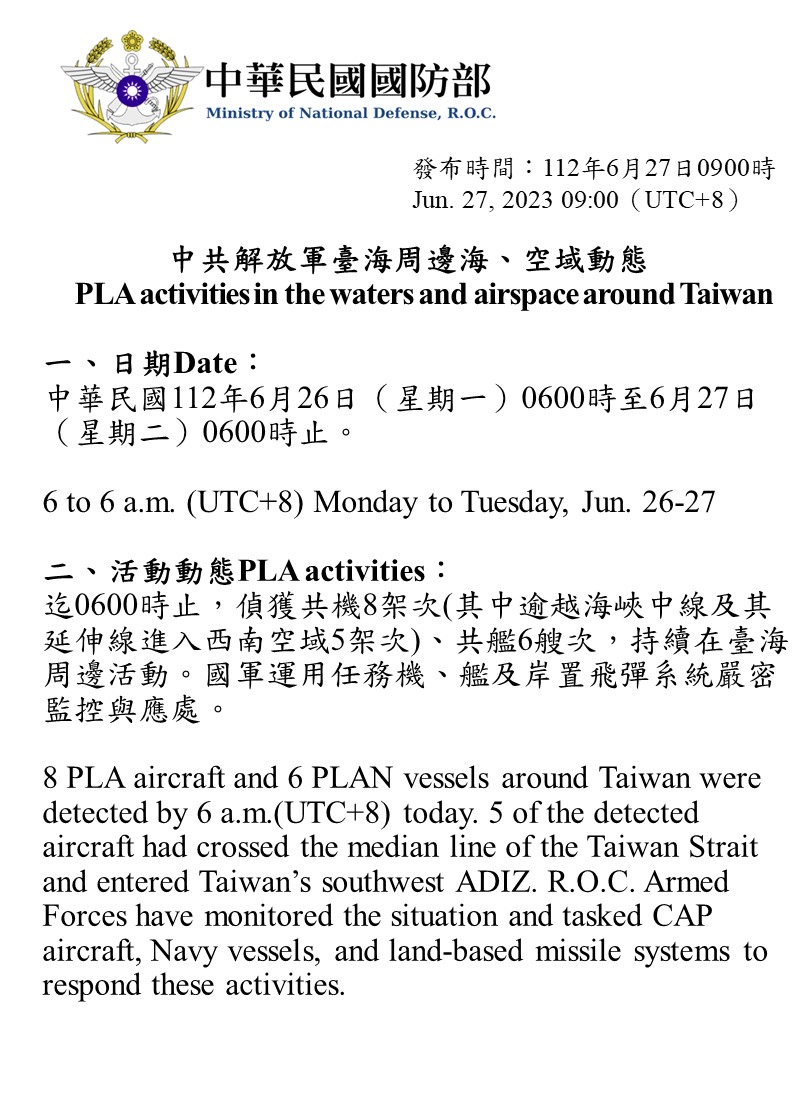 迄0600時止,偵獲共機8架次(其中逾越海峽中線及其延伸線進入西南空域5架次)、共艦6艘次,持續在臺海周邊活動。國軍運用任務機、艦及岸置飛彈系統嚴密監控與應處。