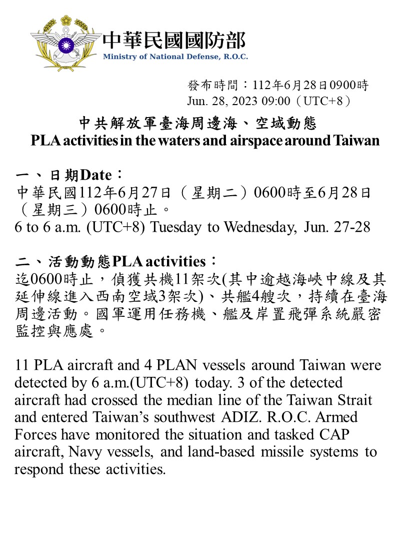 迄0600時止,偵獲共機11架次(其中逾越海峽中線及其延伸線進入西南空域3架次)、共艦4艘次,持續在臺海周邊活動。國軍運用任務機、艦及岸置飛彈系統嚴密監控與應處。
