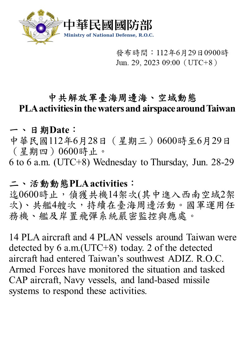 迄0600時止,偵獲共機14架次(其中進入西南空域2架次)、共艦4艘次,持續在臺海周邊活動。國軍運用任務機、艦及岸置飛彈系統嚴密監控與應處。