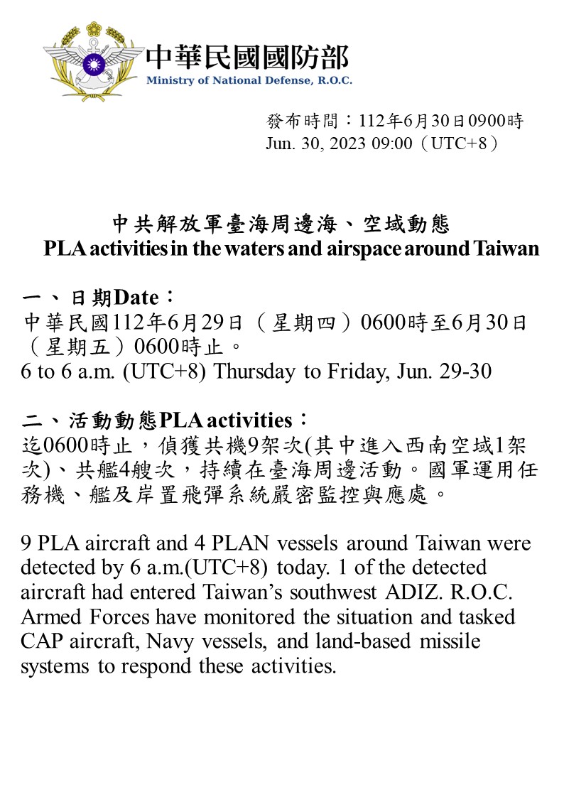 迄0600時止,偵獲共機9架次(其中進入西南空域1架次)、共艦4艘次,持續在臺海周邊活動。國軍運用任務機、艦及岸置飛彈系統嚴密監控與應處。