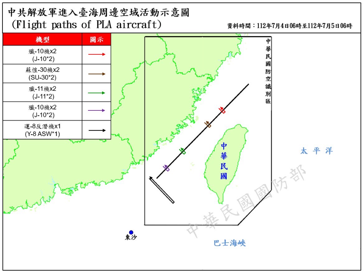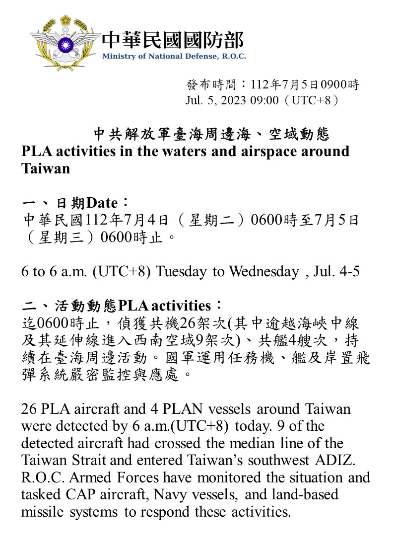 迄0600時止,偵獲共機26架次(其中逾越海峽中線及其延伸線進入西南空域9架次)、共艦4艘次,持續在臺海周邊活動。國軍運用任務機、艦及岸置飛彈系統嚴密監控與應處。
