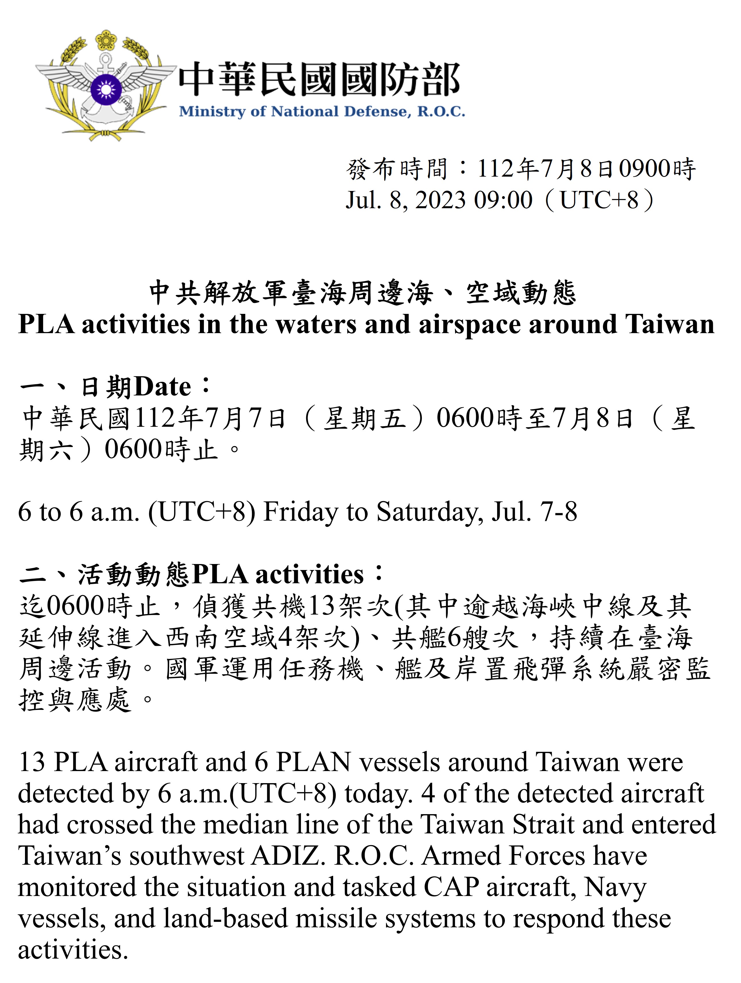 迄0600時止,偵獲共機13架次(其中逾越海峽中線及其延伸線進入西南空域4架次)、共艦6艘次,持續在臺海周邊活動。國軍運用任務機、艦及岸置飛彈系統嚴密監控與應處。