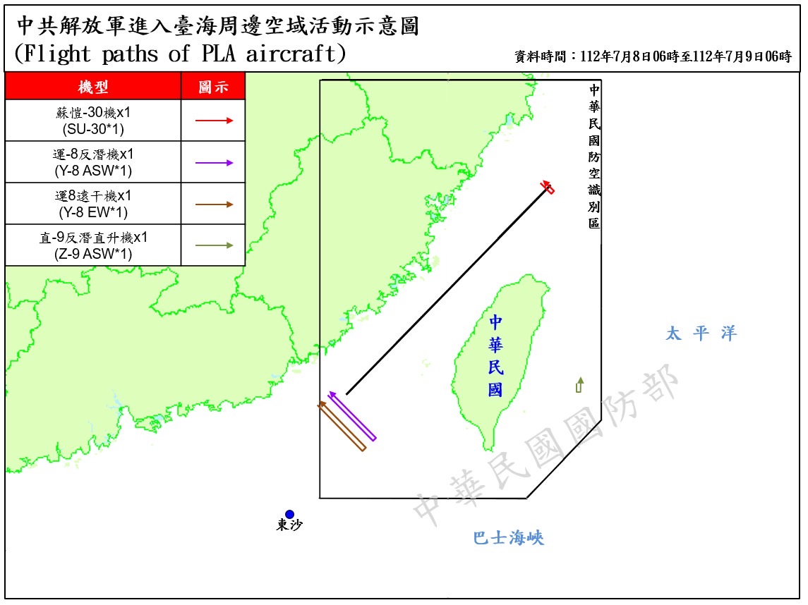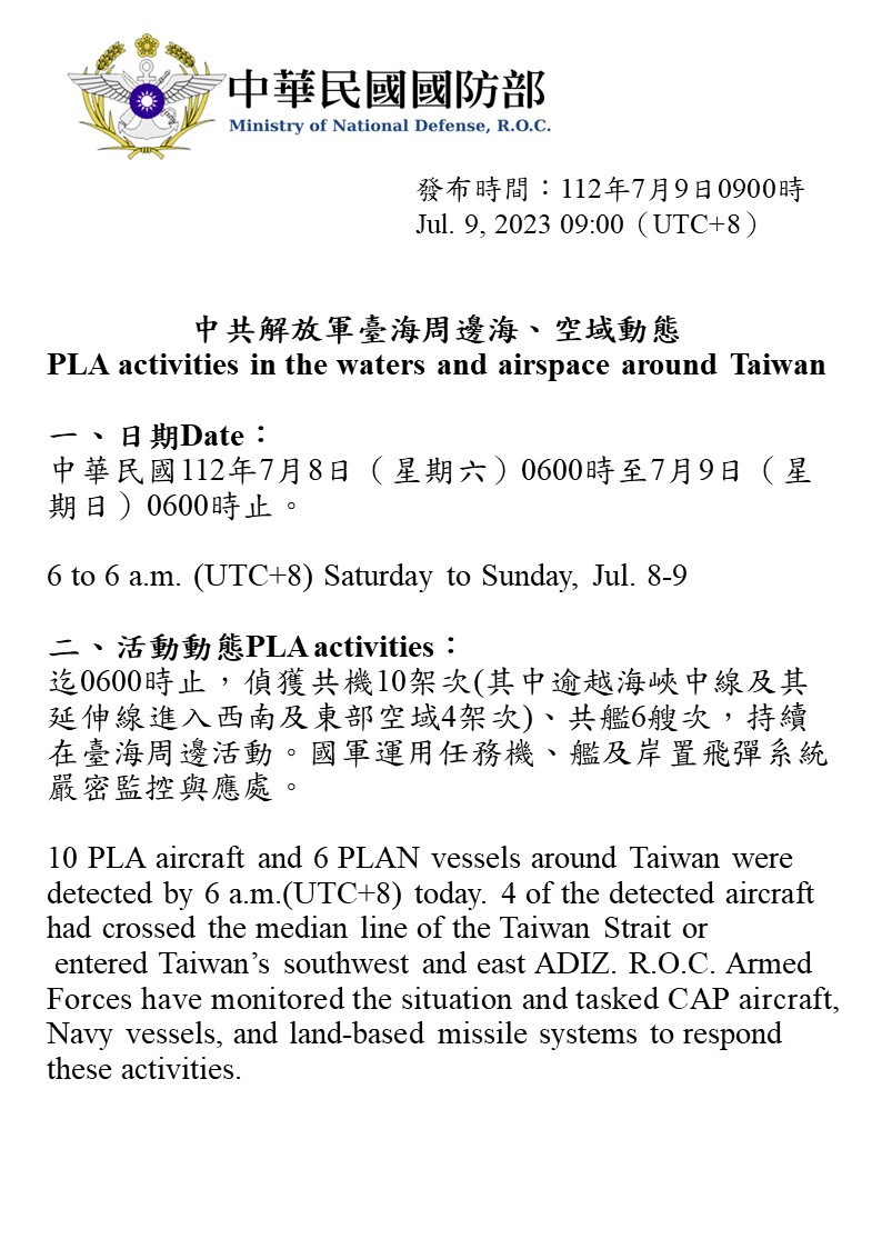 迄0600時止,偵獲共機10架次(其中逾越海峽中線及其延伸線進入西南及東部空域4架次)、共艦6艘次,持續在臺海周邊活動。國軍運用任務機、艦及岸置飛彈系統嚴密監控與應處。