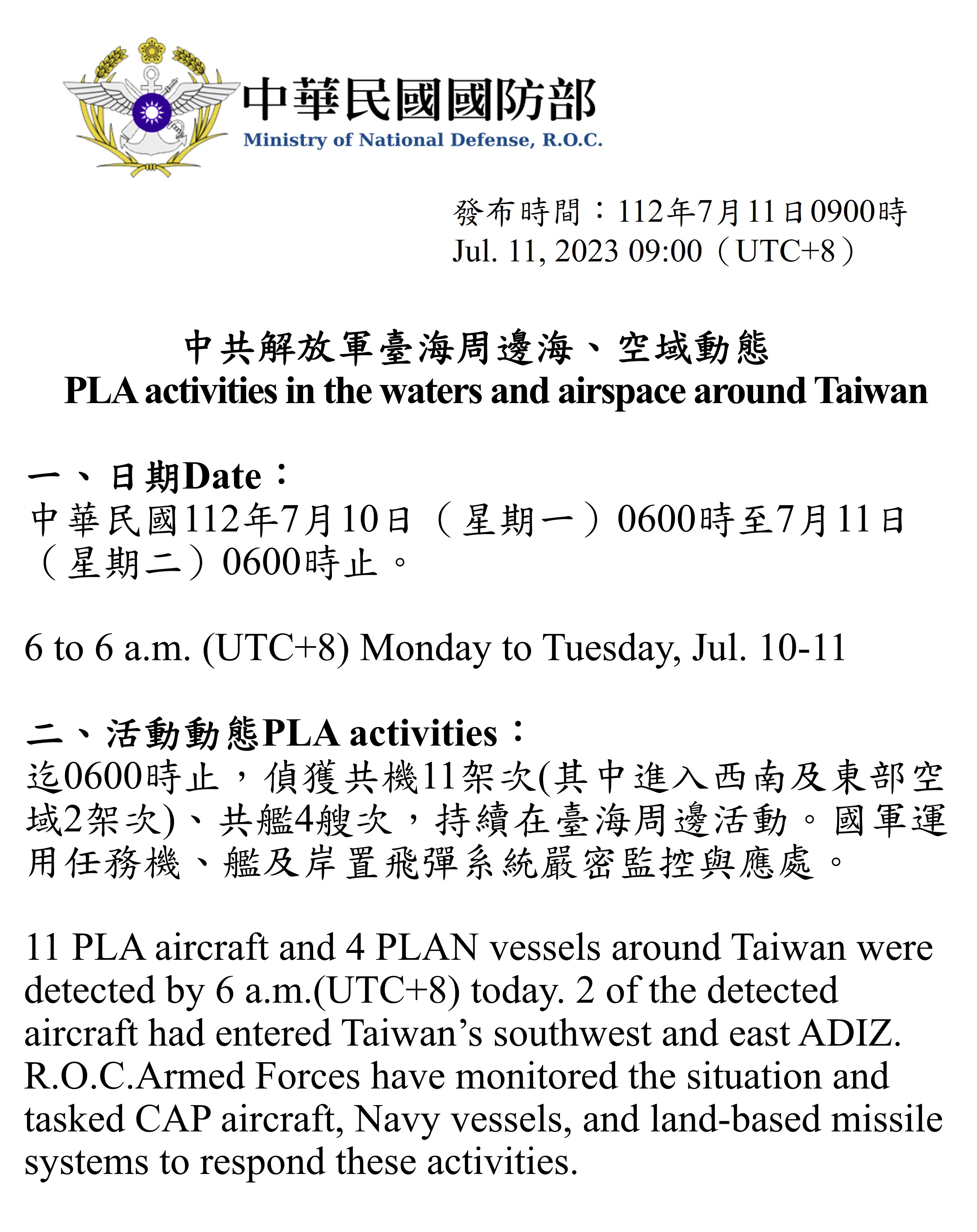迄0600時止,偵獲共機11架次(其中進入西南及東部空域2架次)、共艦4艘次,持續在臺海周邊活動。國軍運用任務機、艦及岸置飛彈系統嚴密監控與應處。