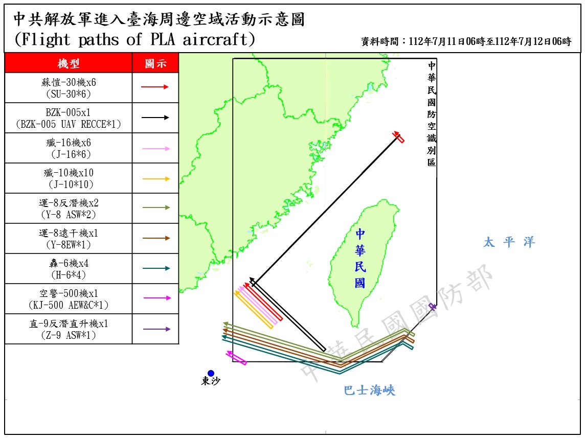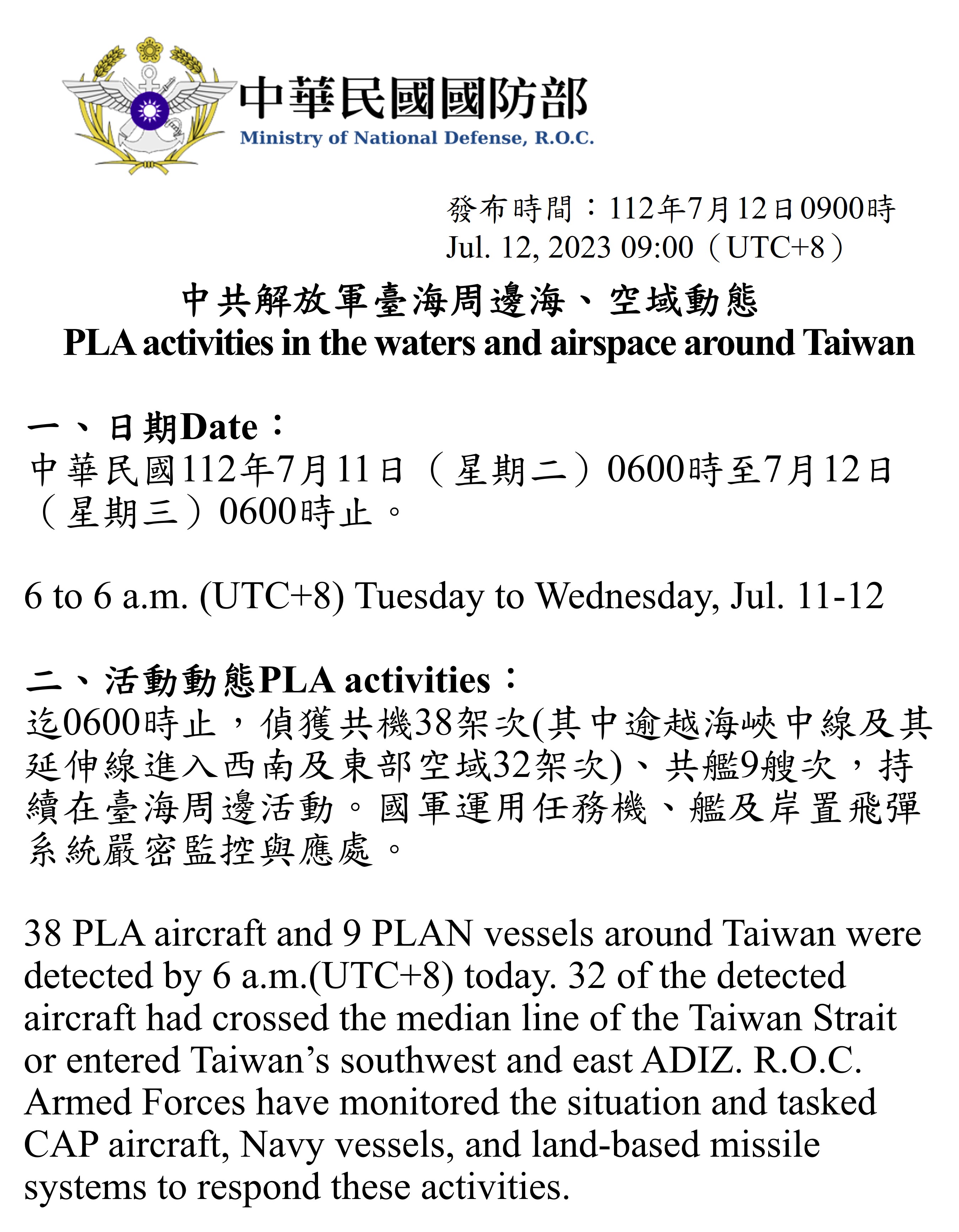 迄0600時止,偵獲共機38架次(其中逾越海峽中線及其延伸線進入西南及東部空域32架次)、共艦9艘次,持續在臺海周邊活動。國軍運用任務機、艦及岸置飛彈系統嚴密監控與應處。