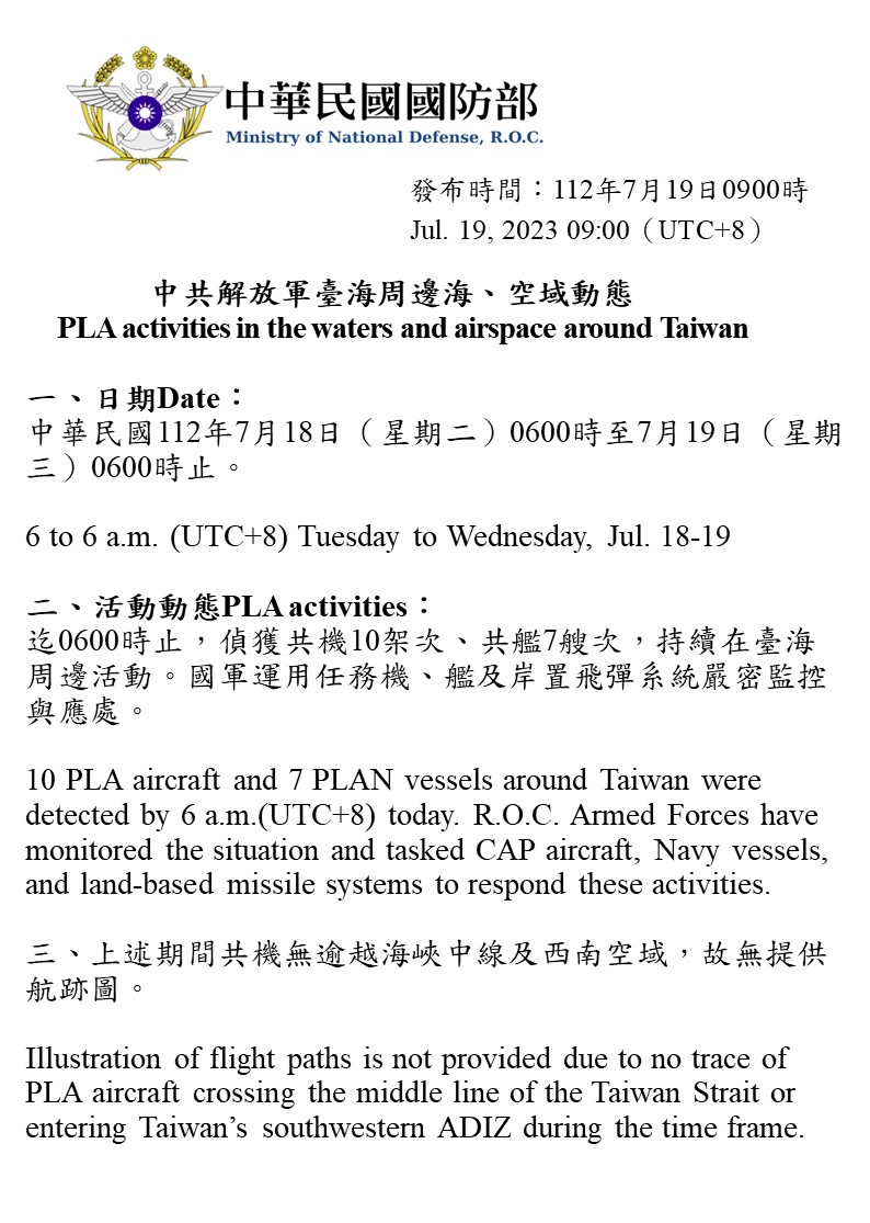 迄0600時止,偵獲共機10架次、共艦7艘次,持續在臺海周邊活動。國軍運用任務機、艦及岸置飛彈系統嚴密監控與應處。