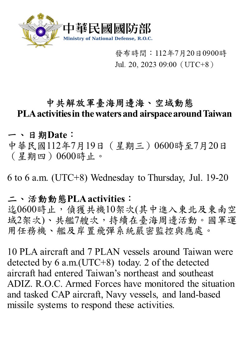 迄0600時止,偵獲共機10架次(其中進入東北及東南空域2架次)、共艦7艘次,持續在臺海周邊活動。國軍運用任務機、艦及岸置飛彈系統嚴密監控與應處。