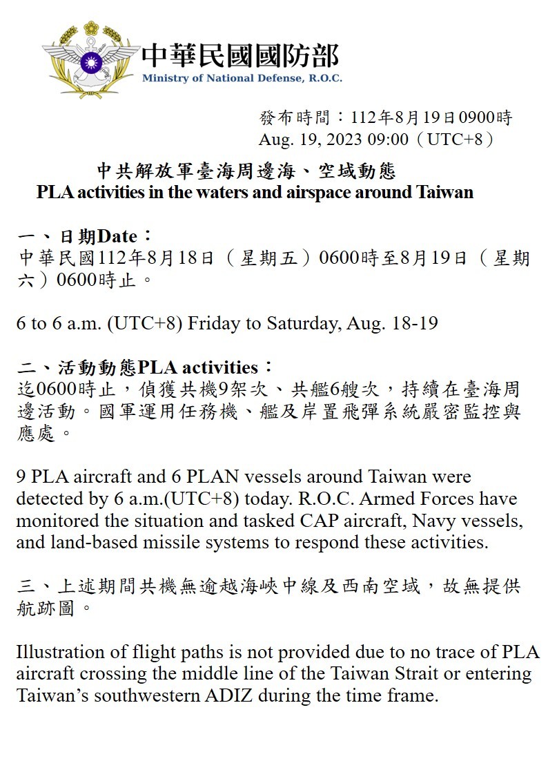 迄0600時止,偵獲共機9架次、共艦6艘次,持續在臺海周邊活動。國軍運用任務機、艦及岸置飛彈系統嚴密監控與應處。