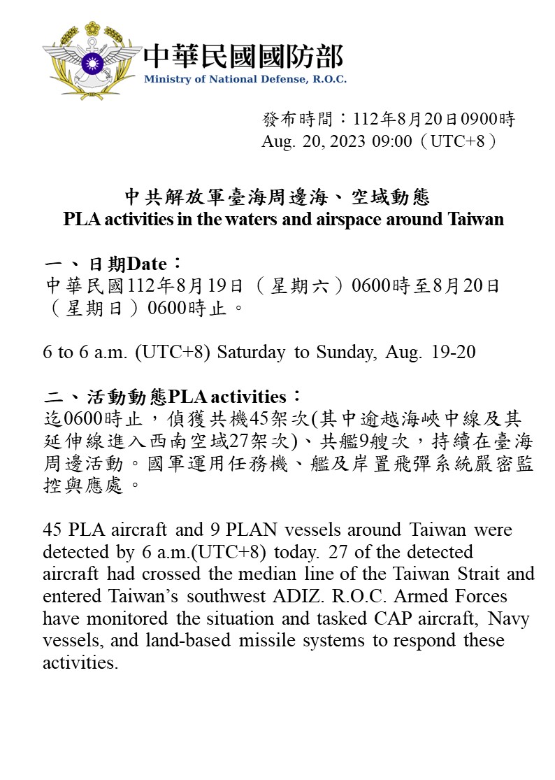 迄0600時止,偵獲共機45架次(其中逾越海峽中線及其延伸線進入西南空域27架次)、共艦9艘次,持續在臺海周邊活動。國軍運用任務機、艦及岸置飛彈系統嚴密監控與應處。