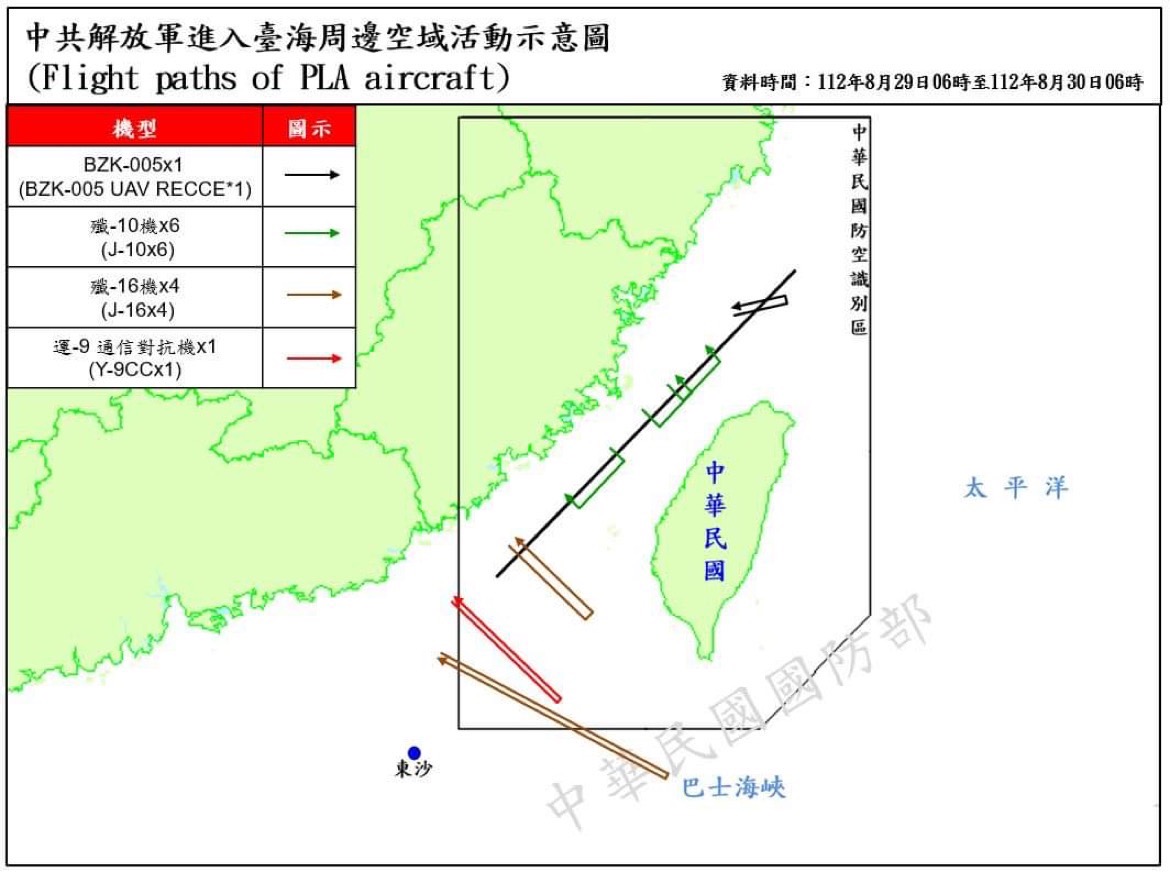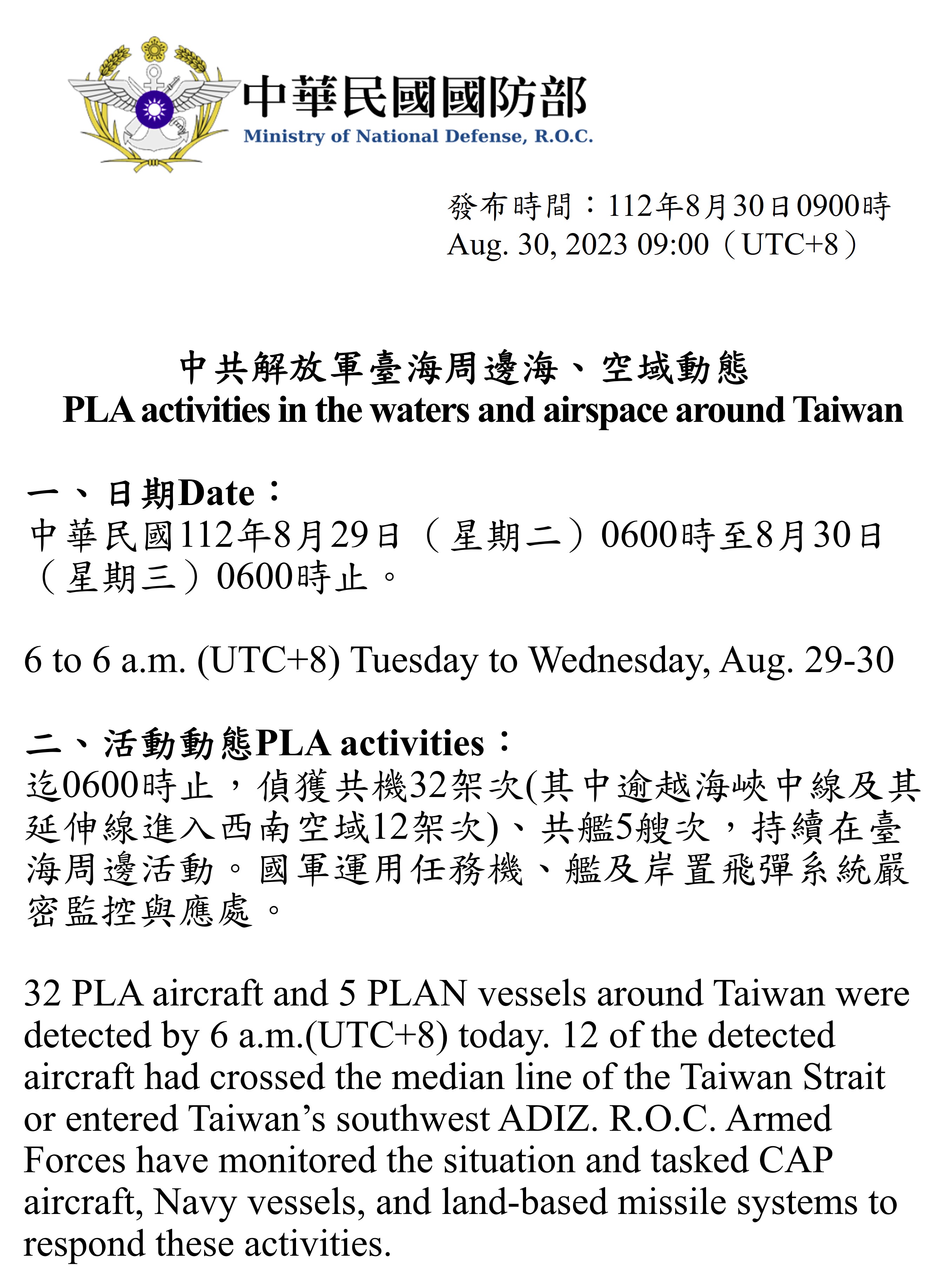 迄0600時止,偵獲共機32架次(其中逾越海峽中線及其延伸線進入西南空域12架次)、共艦5艘次,持續在臺海周邊活動。國軍運用任務機、艦及岸置飛彈系統嚴密監控與應處。
