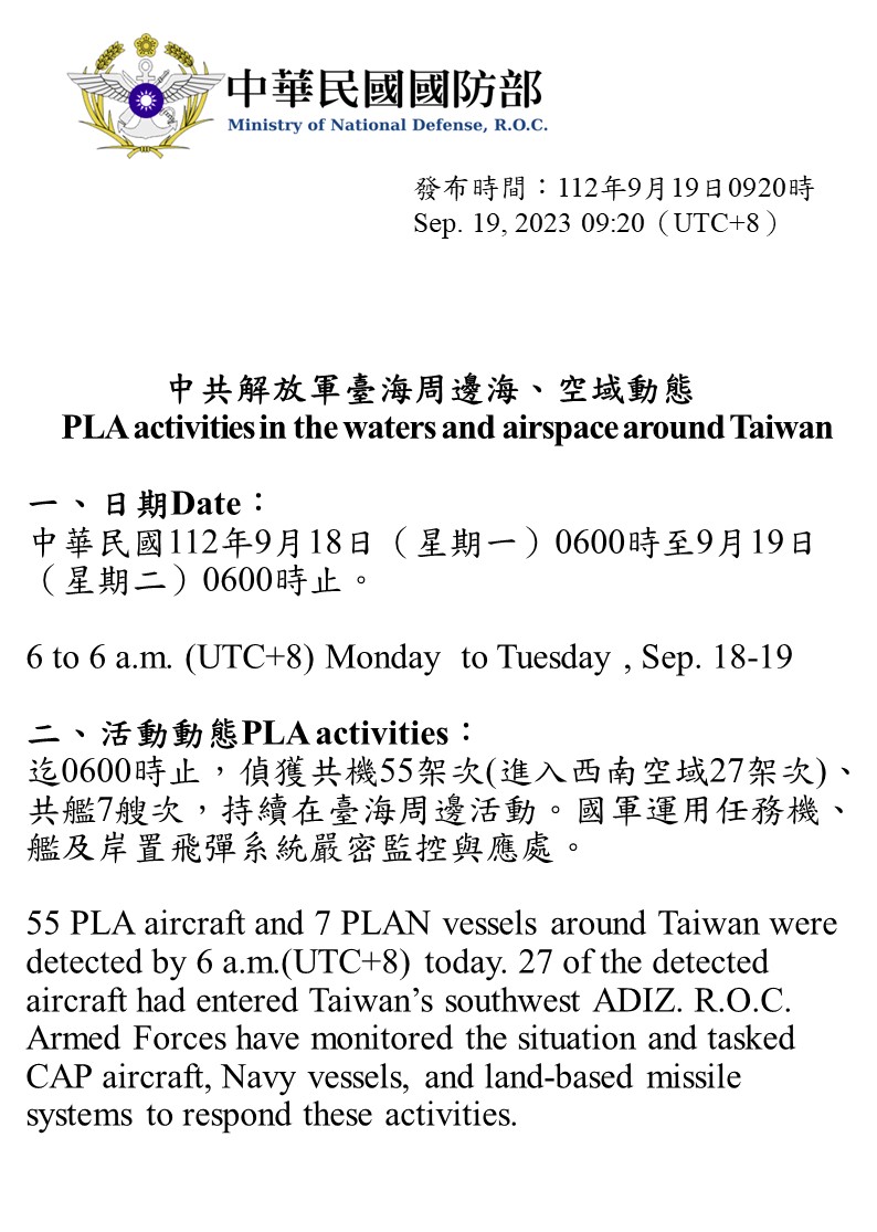 迄0600時止,偵獲共機55架次(進入西南空域27架次)、共艦7艘次,持續在臺海周邊活動。國軍運用任務機、艦及岸置飛彈系統嚴密監控與應處。