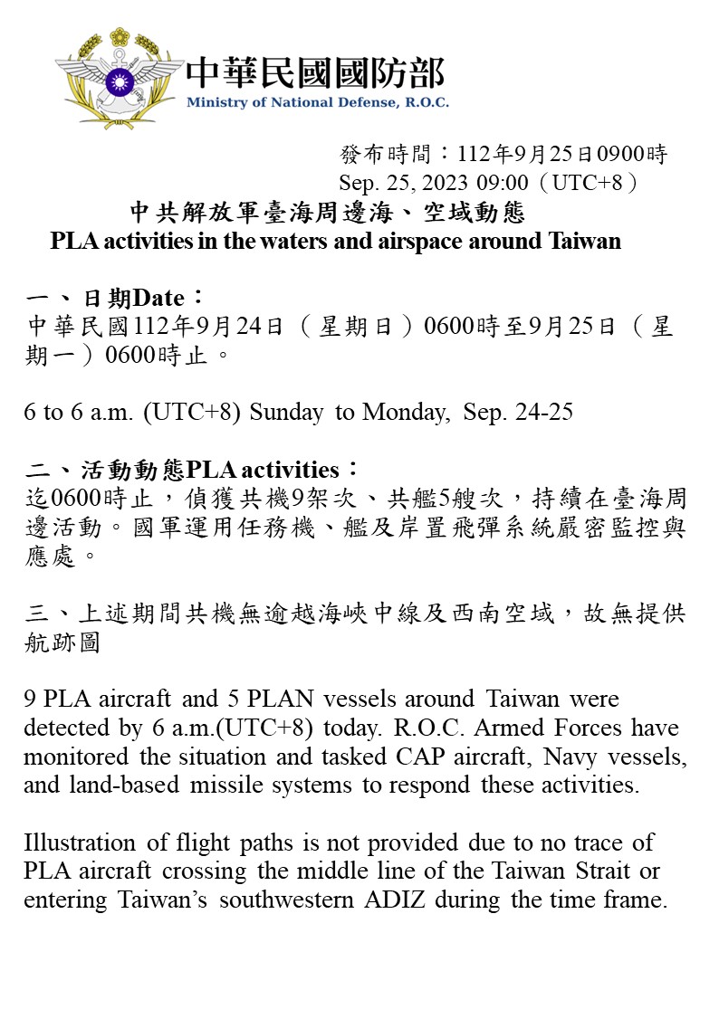 迄0600時止,偵獲共機9架次、共艦5艘次,持續在臺海周邊活動。國軍運用任務機、艦及岸置飛彈系統嚴密監控與應處。