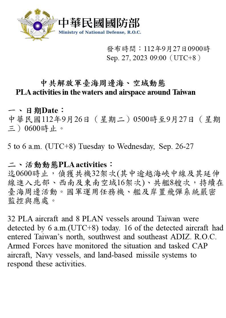 迄0600時止,偵獲共機32架次(其中逾越海峽中線及其延伸線進入北部、西南及東南空域16架次)、共艦8艘次,持續在臺海周邊活動。國軍運用任務機、艦及岸置飛彈系統嚴密監控與應處。