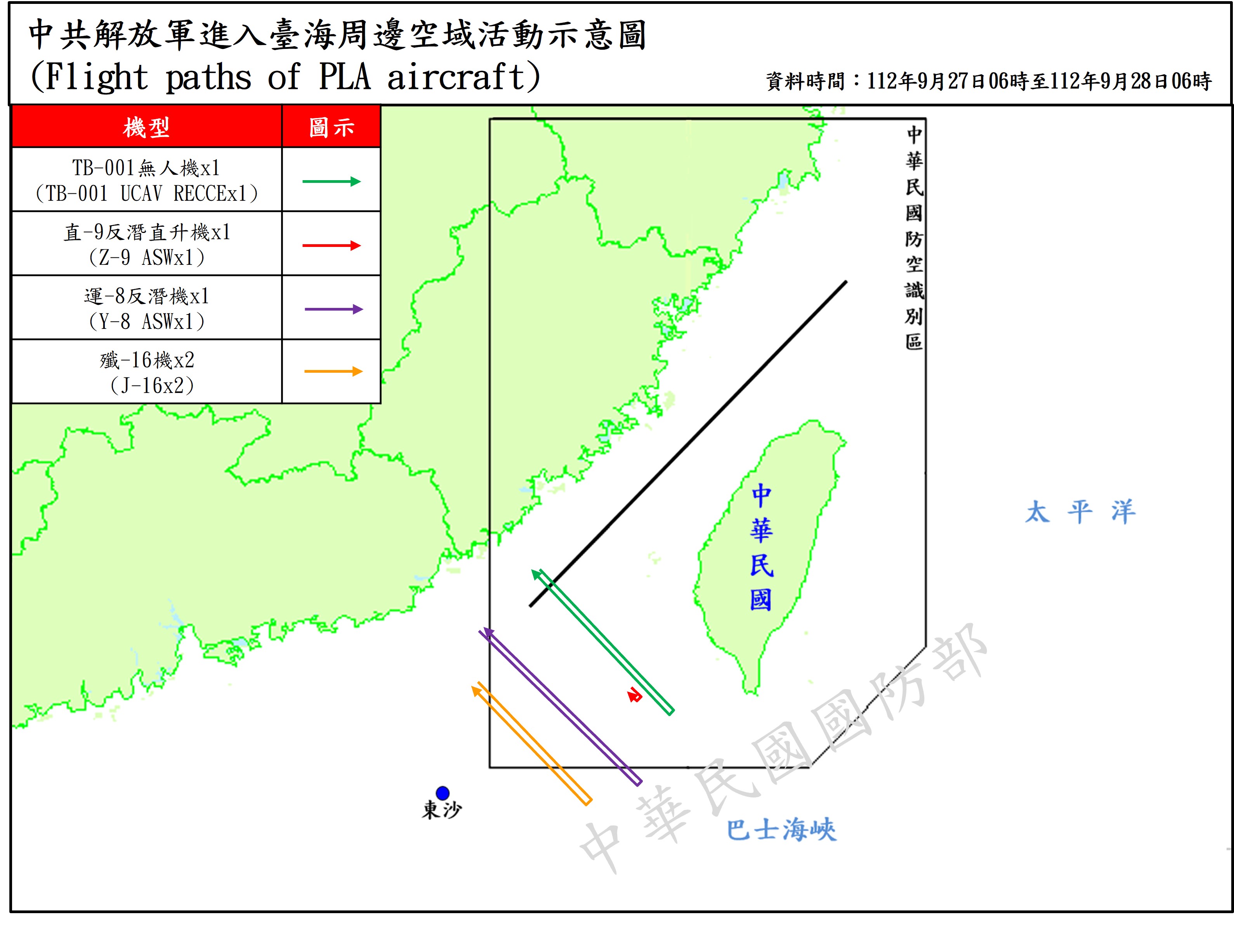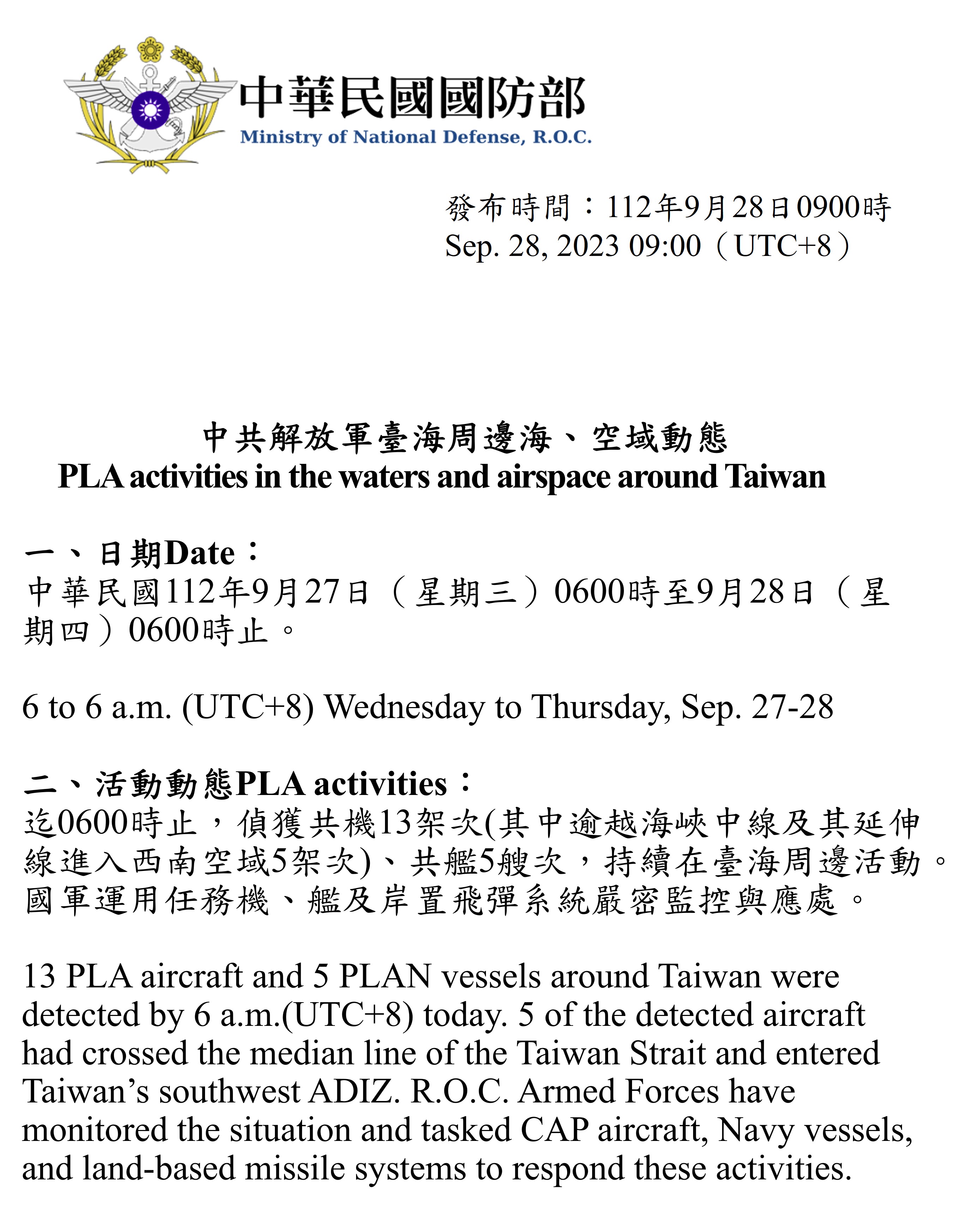 迄0600時止,偵獲共機13架次(其中逾越海峽中線及其延伸線進入西南空域5架次)、共艦5艘次,持續在臺海周邊活動。國軍運用任務機、艦及岸置飛彈系統嚴密監控與應處。