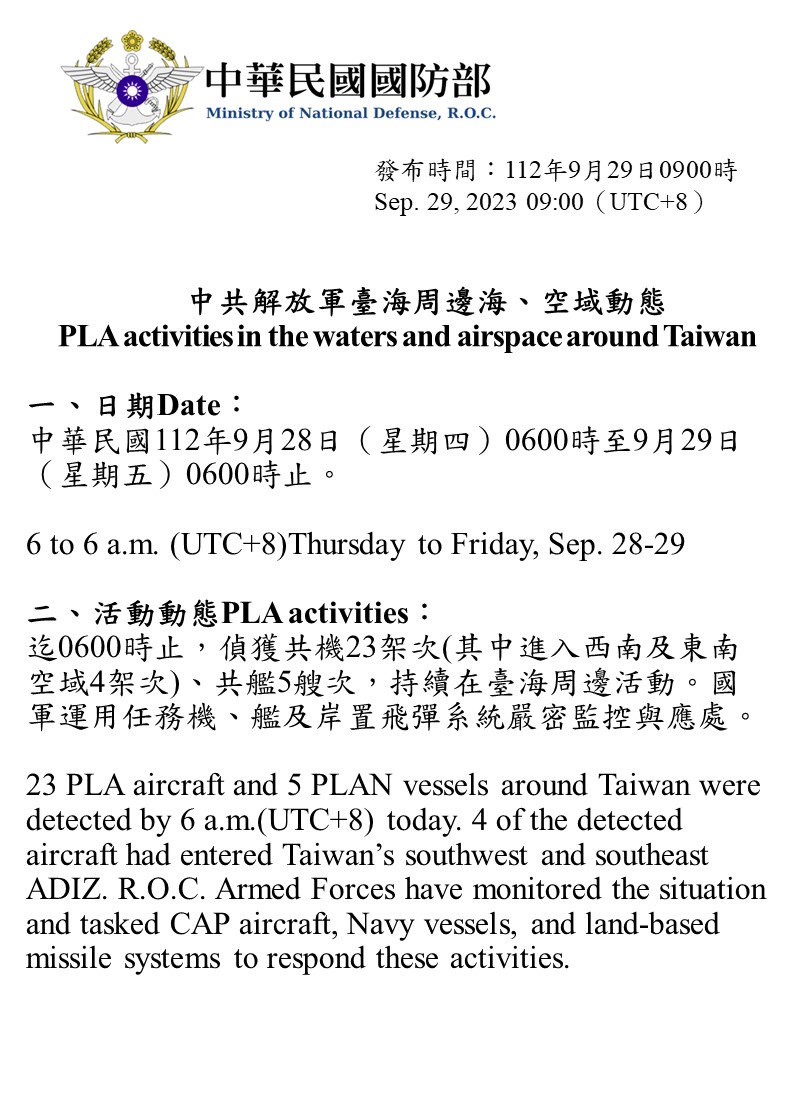 迄0600時止,偵獲共機23架次(其中進入西南及東南空域4架次)、共艦5艘次,持續在臺海周邊活動。國軍運用任務機、艦及岸置飛彈系統嚴密監控與應處。