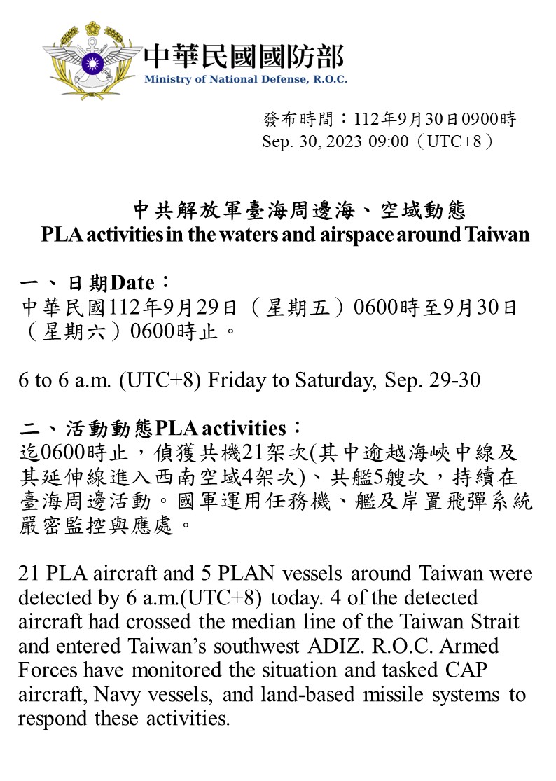 迄0600時止,偵獲共機21架次(其中逾越海峽中線及其延伸線進入西南空域4架次)、共艦5艘次,持續在臺海周邊活動。國軍運用任務機、艦及岸置飛彈系統嚴密監控與應處。