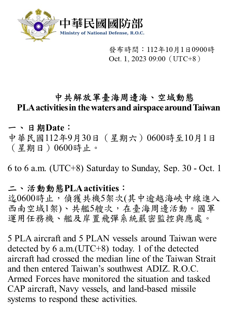 迄0600時止,偵獲共機5架次(其中逾越海峽中線進入西南空域1架)、共艦5艘次,在臺海周邊活動。國軍運用任務機、艦及岸置飛彈系統嚴密監控與應處。