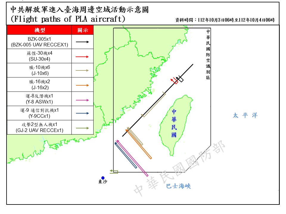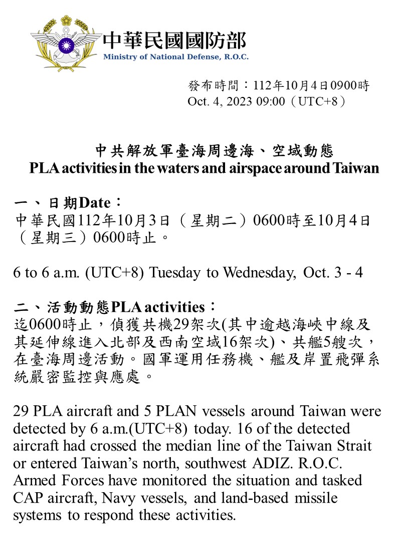 迄0600時止,偵獲共機29架次(其中逾越海峽中線及其延伸線進入北部及西南空域16架次)、共艦5艘次,在臺海周邊活動。國軍運用任務機、艦及岸置飛彈系統嚴密監控與應處。
