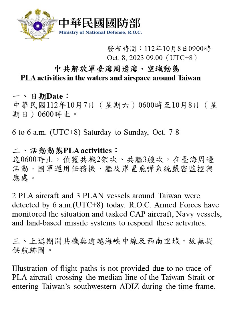 迄0600時止,偵獲共機2架次、共艦3艘次,在臺海周邊活動。國軍運用任務機、艦及岸置飛彈系統嚴密監控與應處。