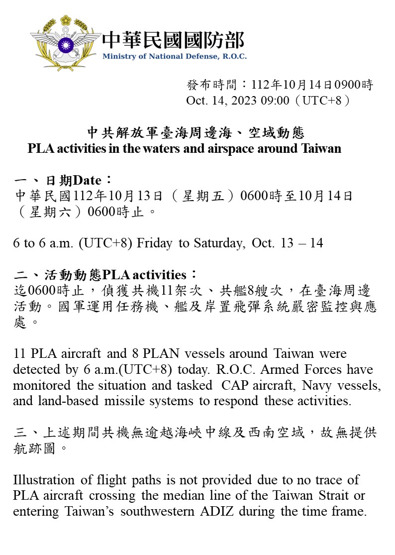 迄0600時止,偵獲共機11架次、共艦8艘次,在臺海周邊活動。國軍運用任務機、艦及岸置飛彈系統嚴密監控與應處。