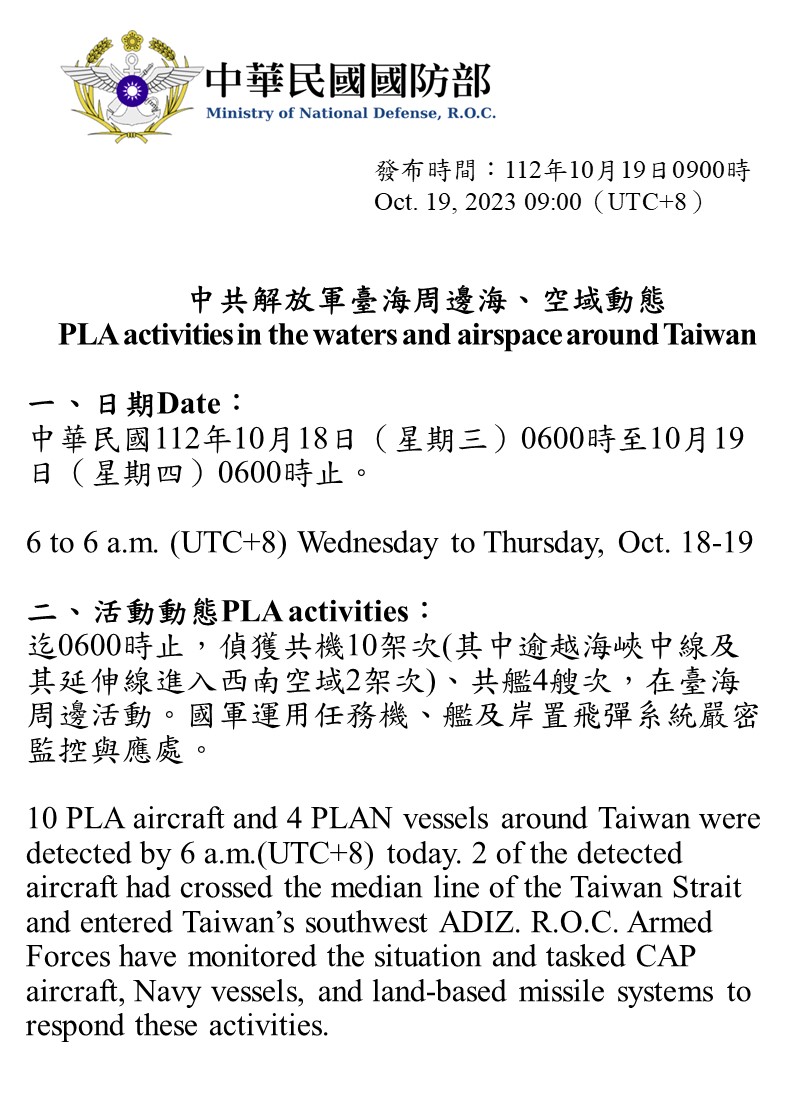 迄0600時止,偵獲共機10架次(其中逾越海峽中線及其延伸線進入西南空域2架次)、共艦4艘次,在臺海周邊活動。國軍運用任務機、艦及岸置飛彈系統嚴密監控與應處。