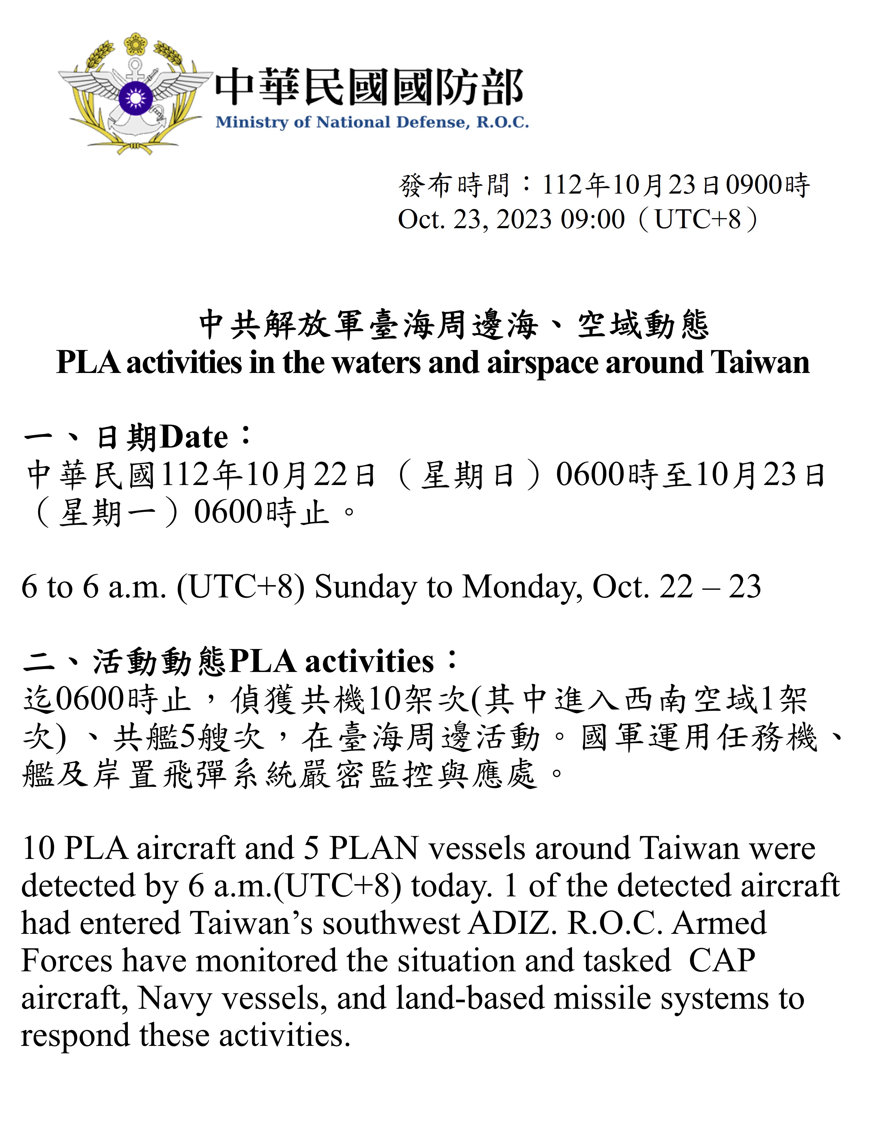 迄0600時止,偵獲共機10架次(其中進入西南空域1架次)、共艦5艘次,在臺海周邊活動。國軍運用任務機、艦及岸置飛彈系統嚴密監控與應處。