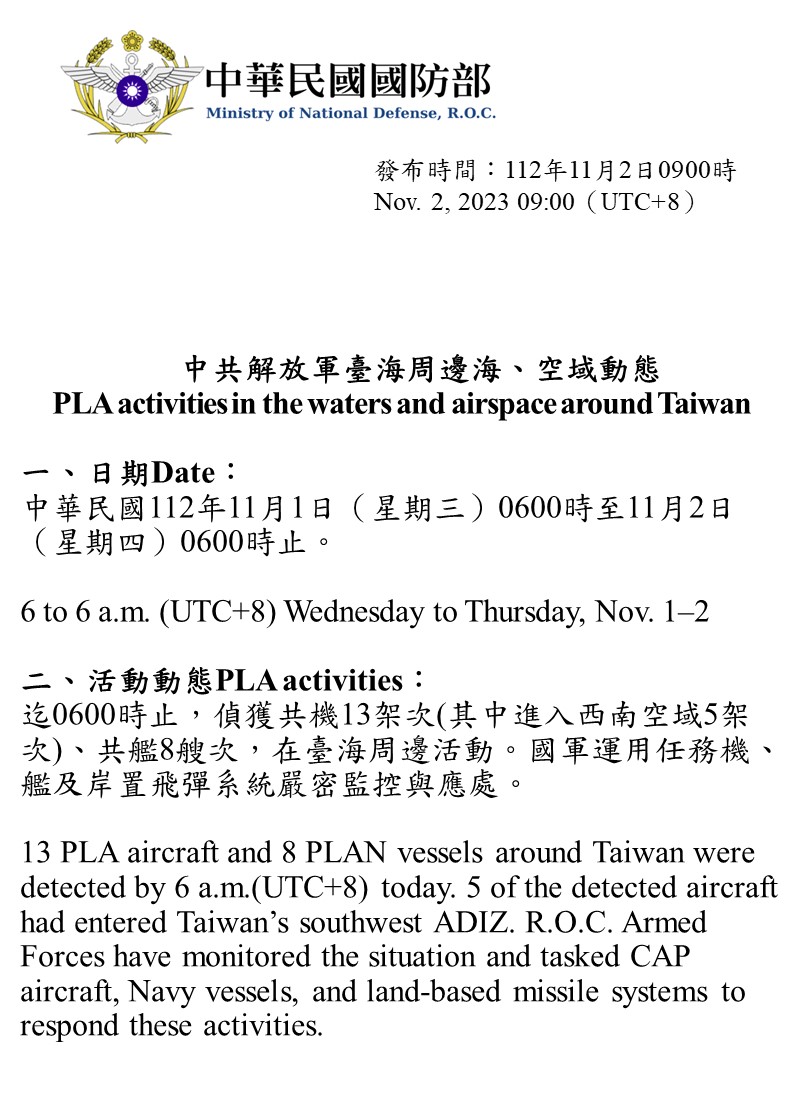 迄0600時止,偵獲共機13架次(其中進入西南空域5架次)、共艦8艘次,在臺海周邊活動。國軍運用任務機、艦及岸置飛彈系統嚴密監控與應處。