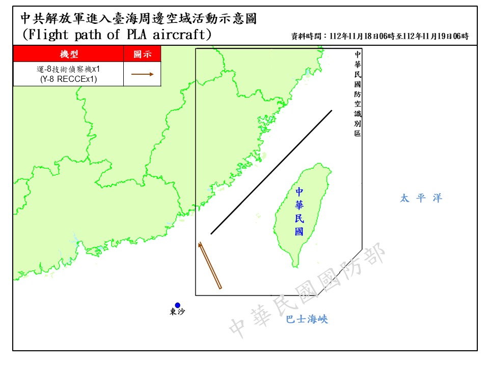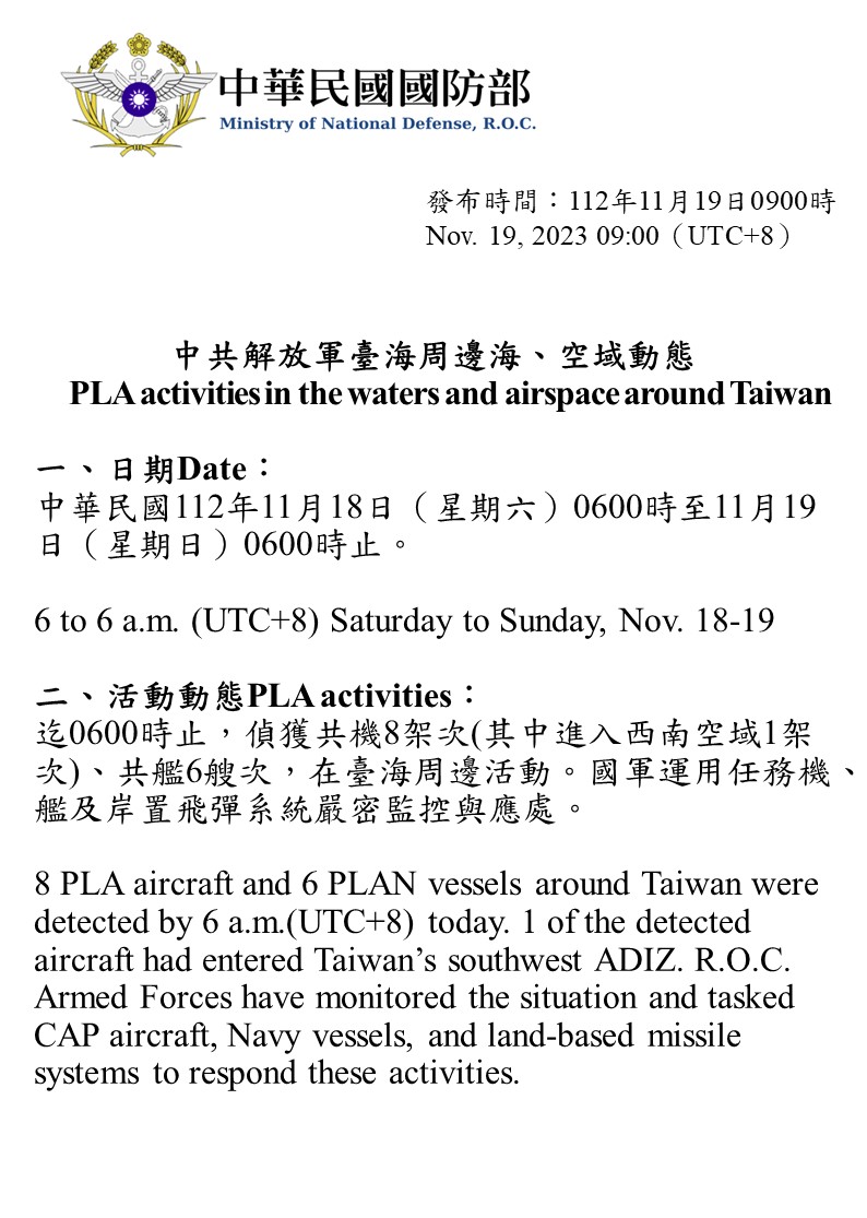 迄0600時止,偵獲共機8架次(其中進入西南空域1架次)、共艦6艘次,在臺海周邊活動。國軍運用任務機、艦及岸置飛彈系統嚴密監控與應處。