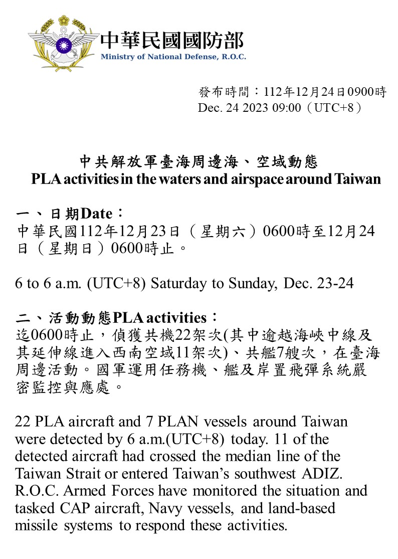 迄0600時止,偵獲共機22架次(其中逾越海峽中線及其延伸線進入西南空域11架次)、共艦7艘次,在臺海周邊活動。國軍運用任務機、艦及岸置飛彈系統嚴密監控與應處。