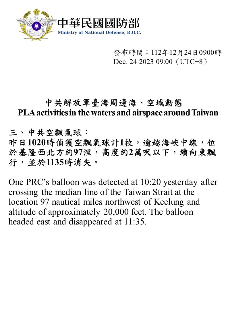 昨日1020時偵獲空飄氣球計1枚,逾越海峽中線,位於基隆西北方約97浬,高度約2萬呎以下,續向東飄行,並於1135時消失。