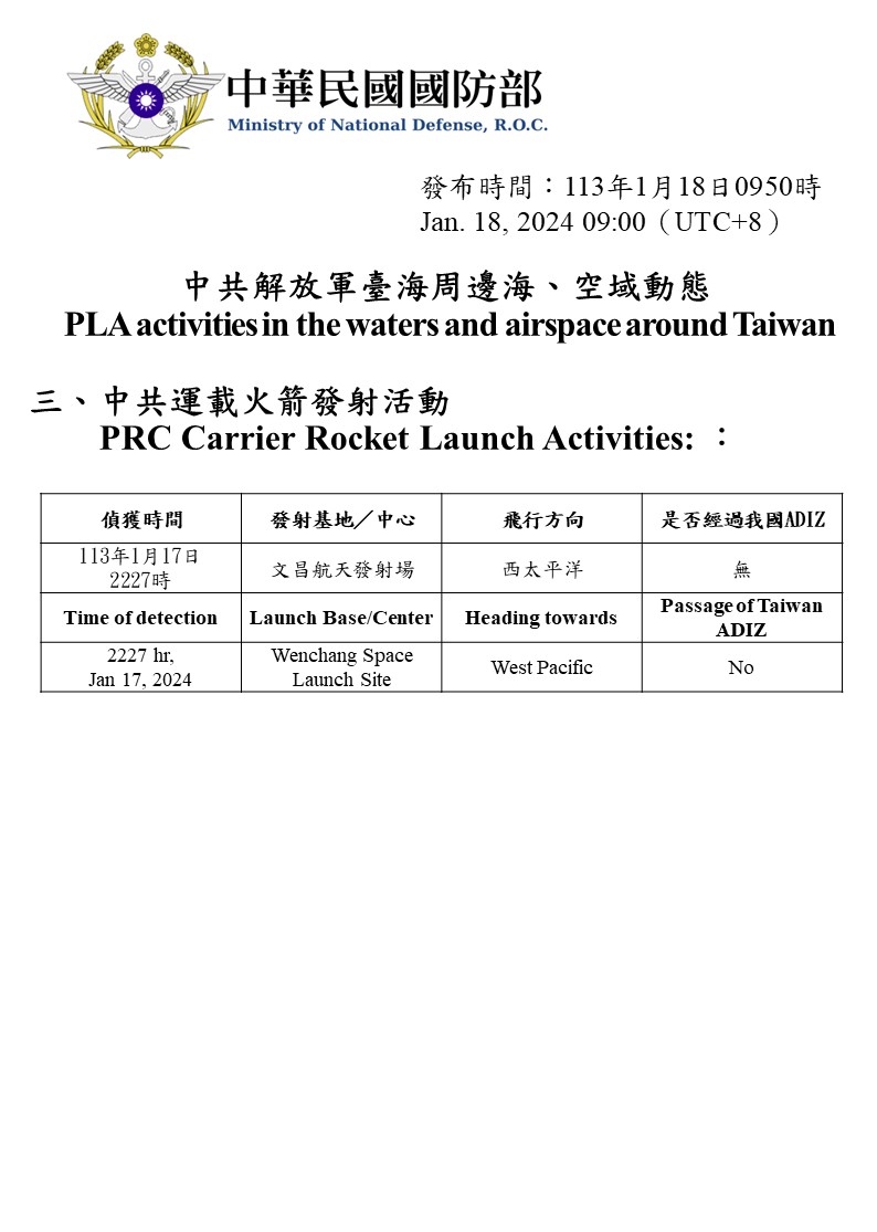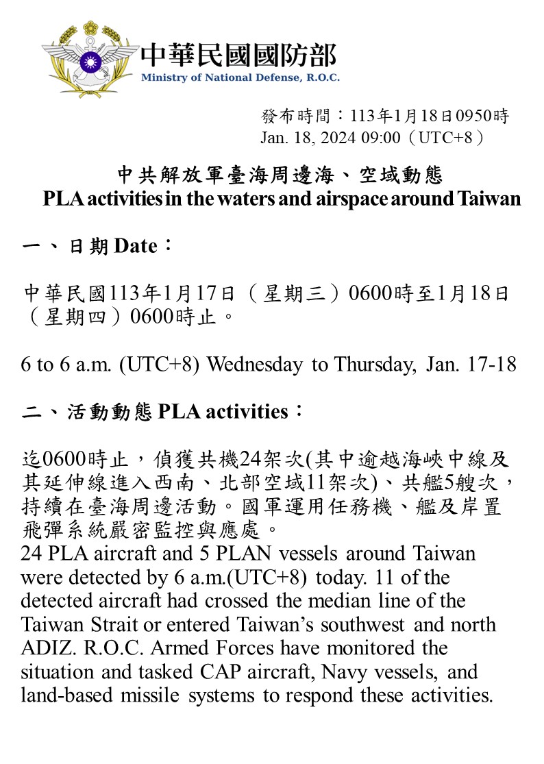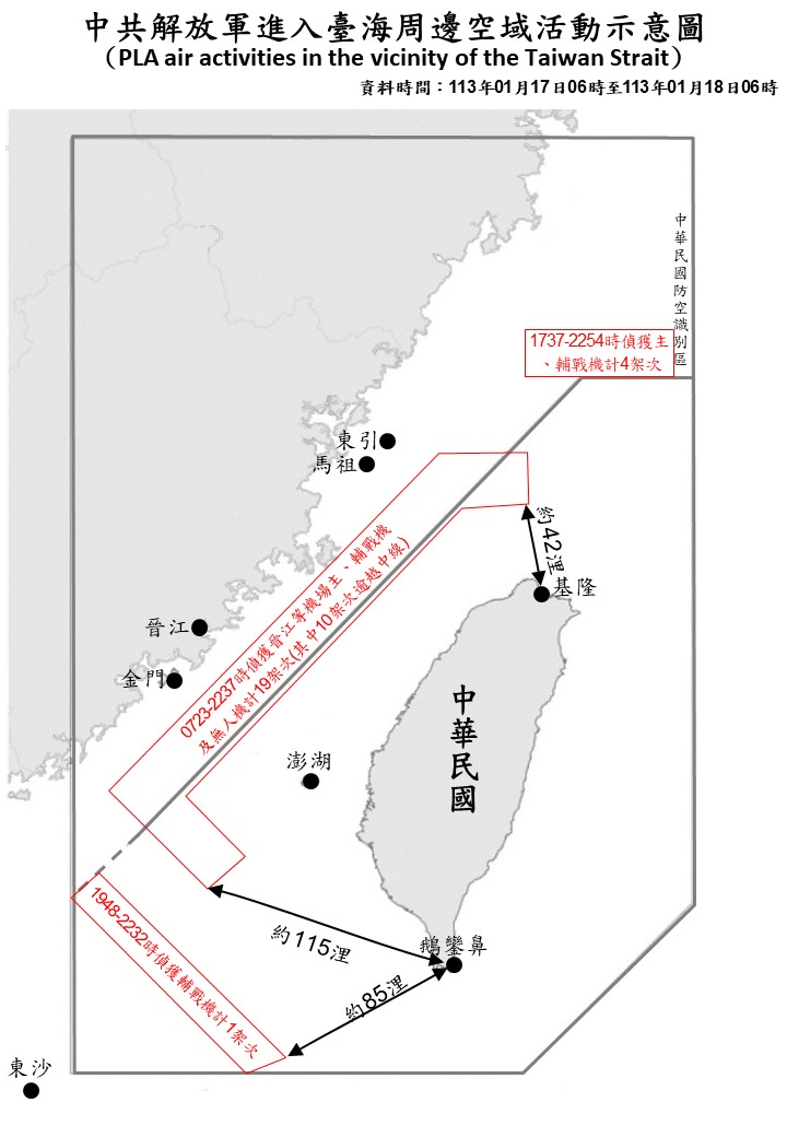中共解放軍臺海周邊海、空域動態(113年1月18日)