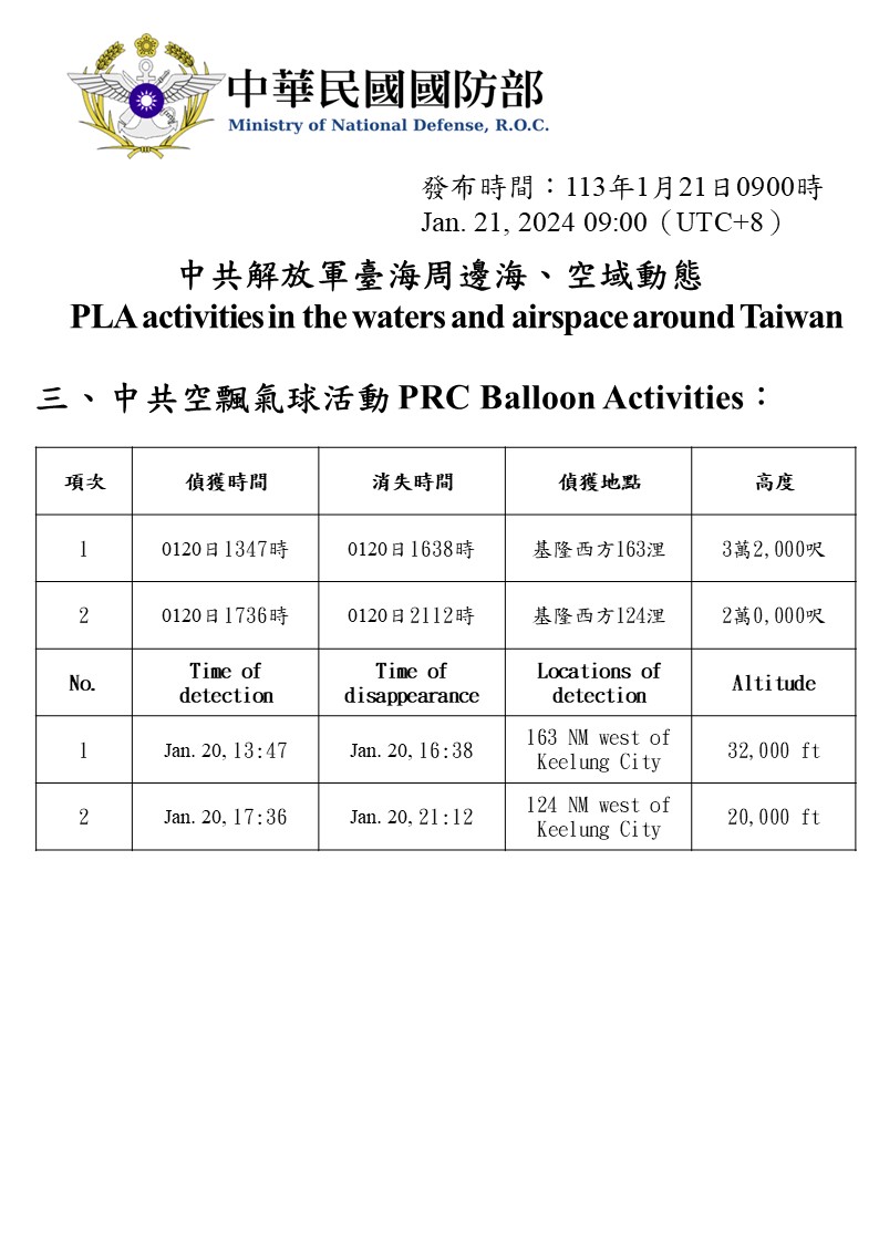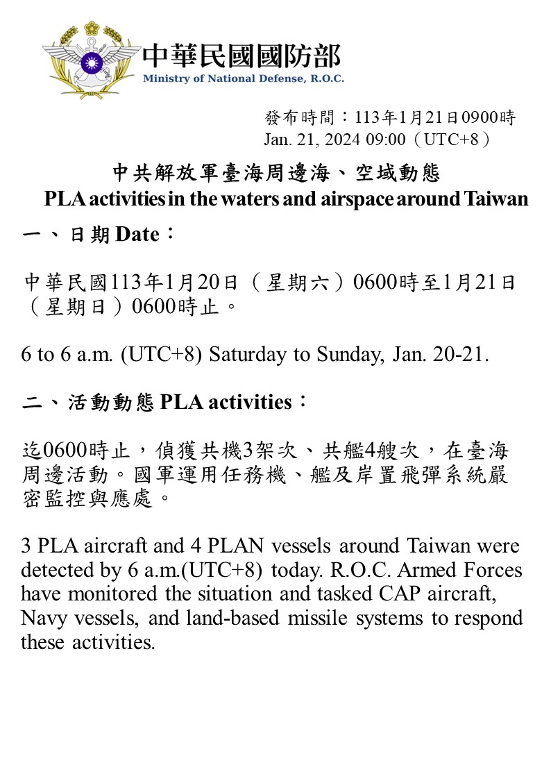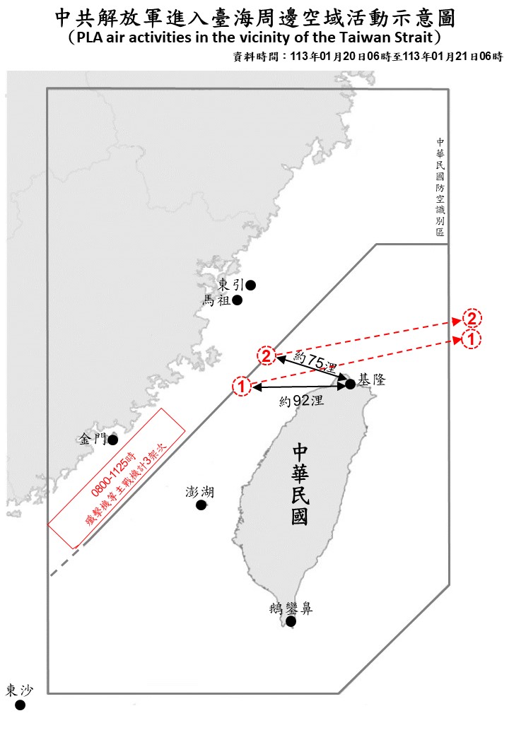 中共解放軍臺海周邊海、空域動態(113年1月21日)