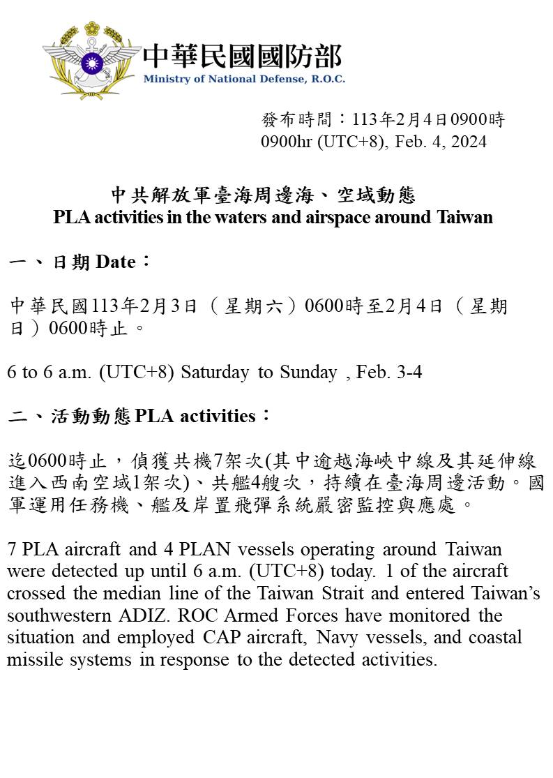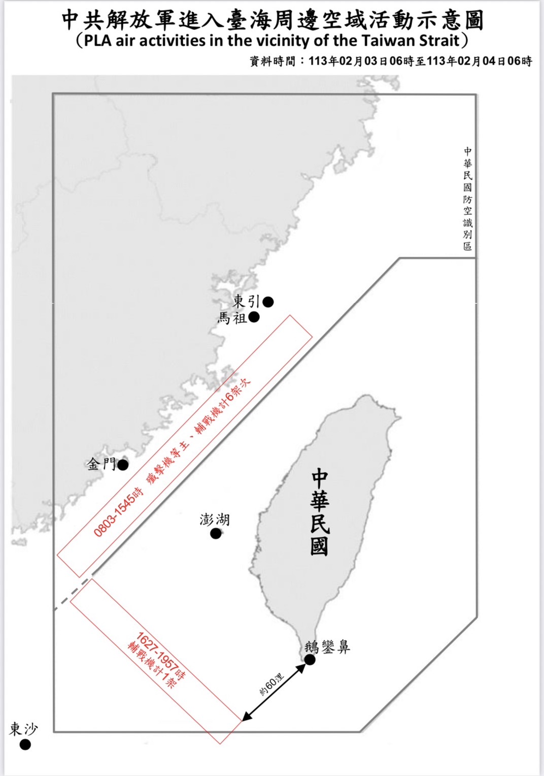 中共解放軍臺海周邊海、空域動態(113年2月4日)