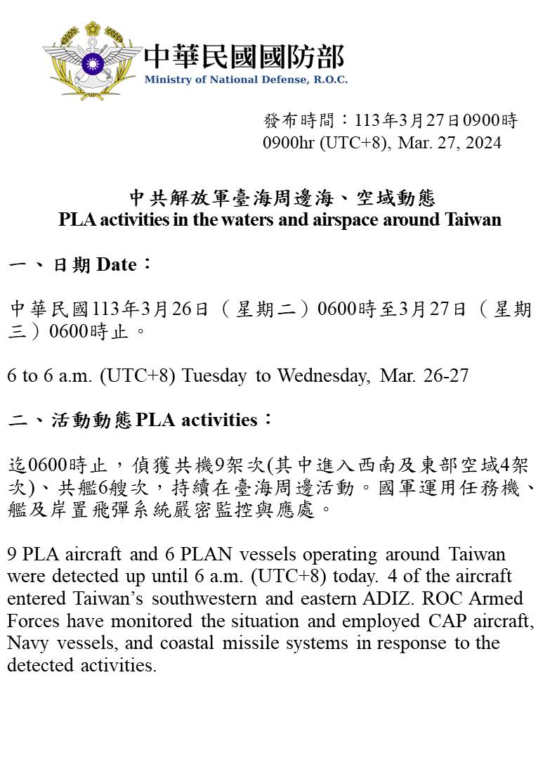 中共解放軍臺海周邊海、空域動態(113年3月27日)