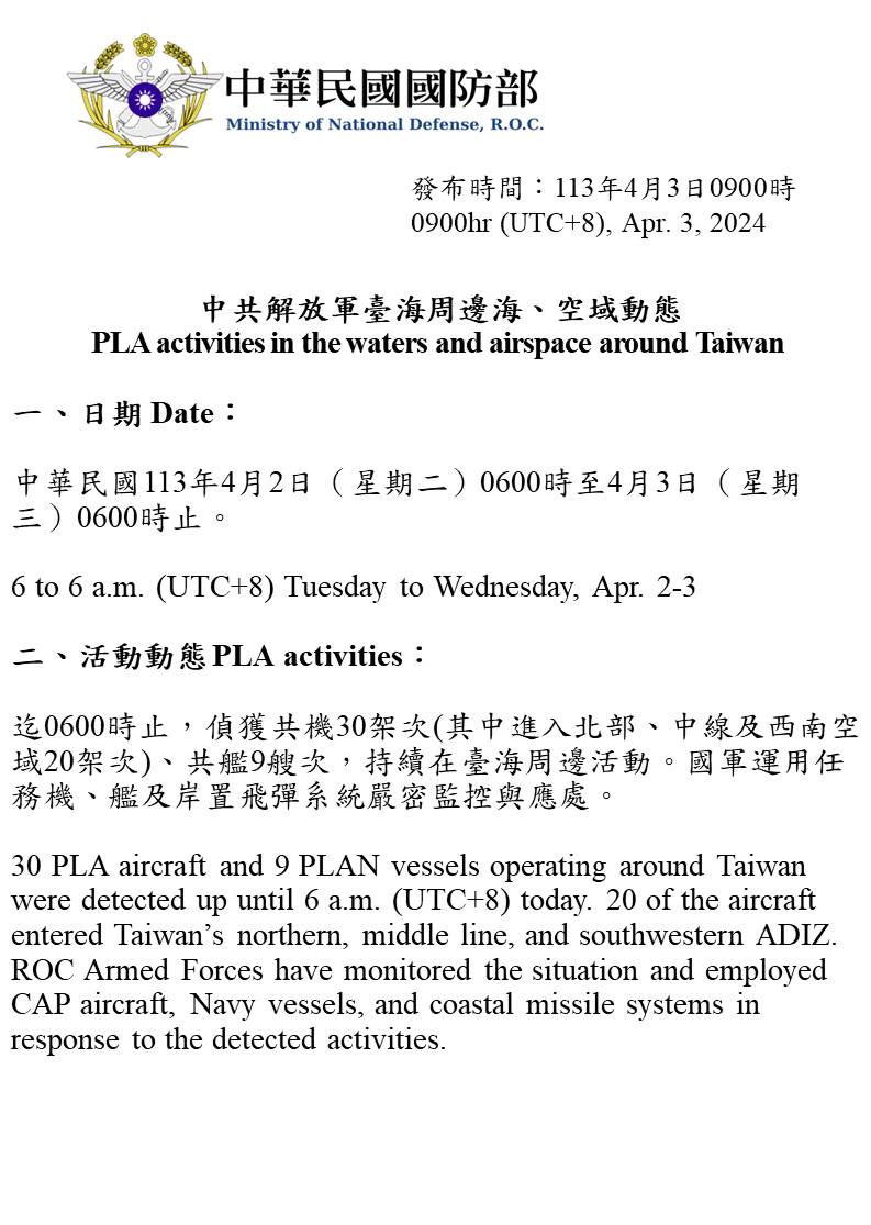中共解放軍臺海周邊海、空域動態(113年4月3日)