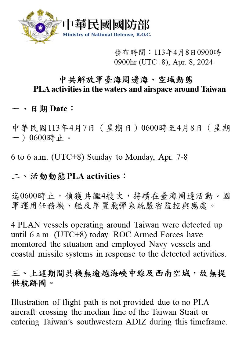 中共解放軍臺海周邊海、空域動態(113年4月8日)