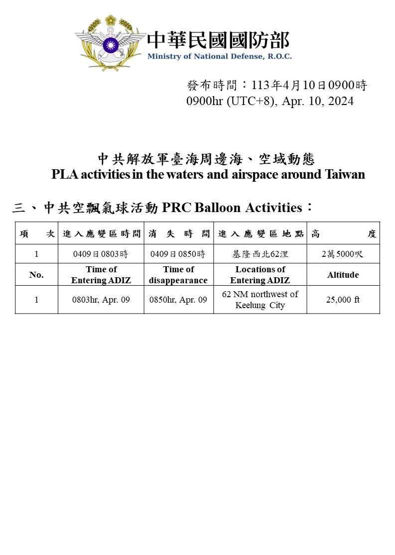 中共解放軍臺海周邊海、空域動態(113年4月10日)