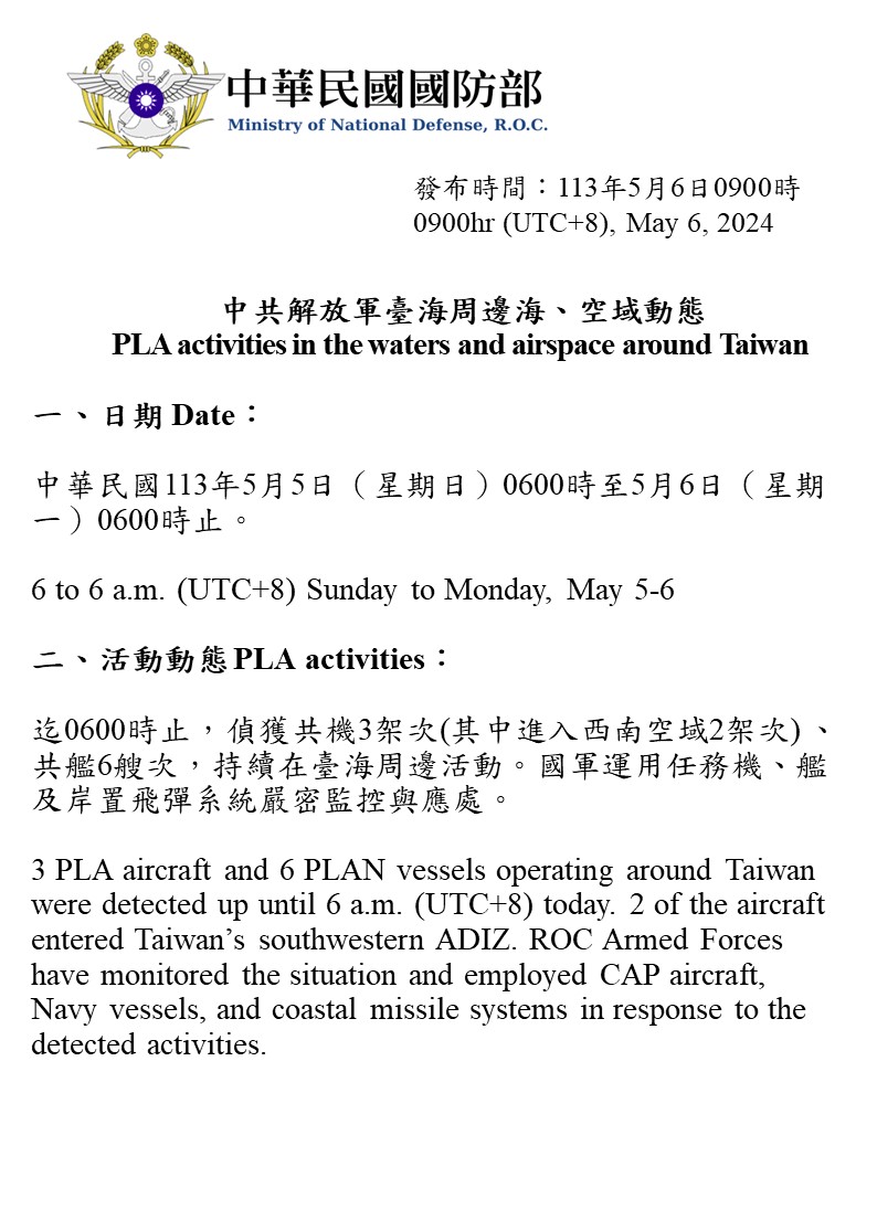 中共解放軍臺海周邊海、空域動態(113年5月6日)