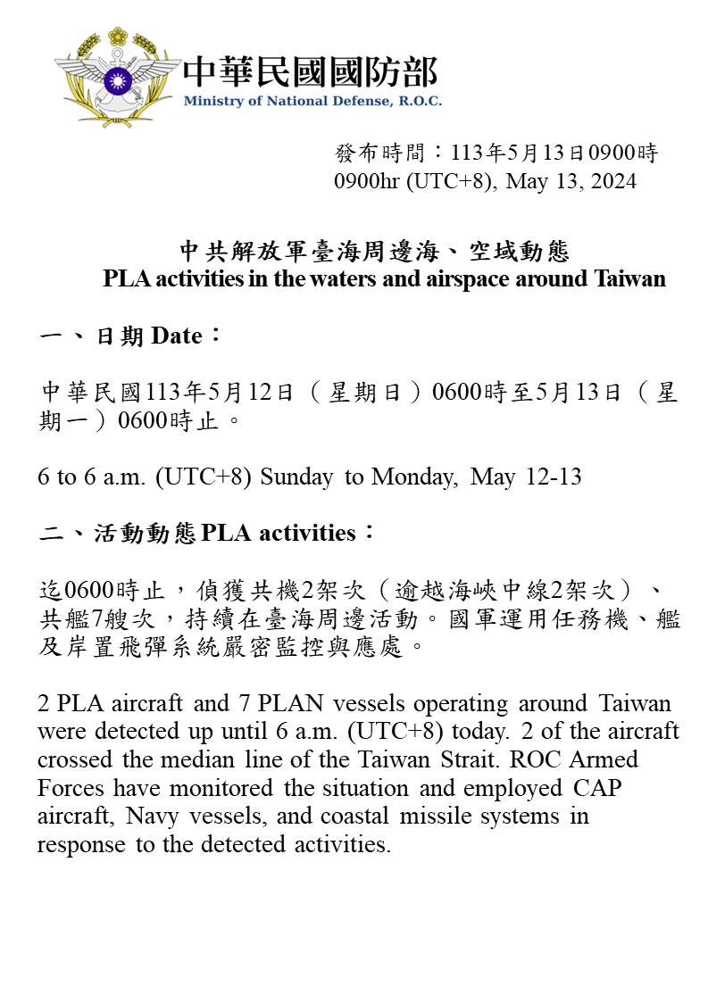 中共解放軍臺海周邊海、空域動態(113年5月13日)