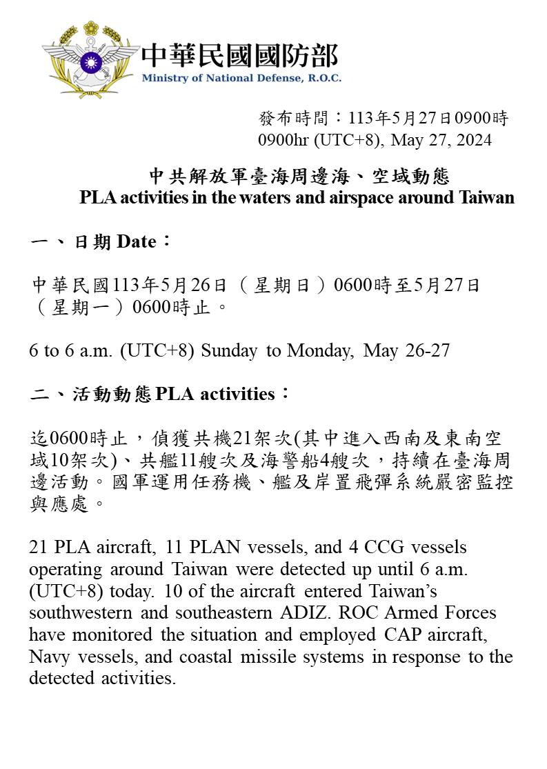 中共解放軍臺海周邊海、空域動態(113年5月27日)
