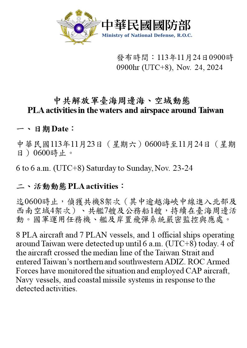 1131124_臺海周邊海、空域活動