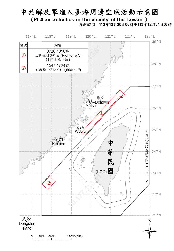 5 PLA aircraft and 6 PLAN vessels operating around Taiwan were detected up until 6 a.m. (UTC+8) today. 3 of the aircraft crossed the median line of the Taiwan Strait and entered Taiwan’s northern and southwestern ADIZ. ROC Armed Forces have monitored the situation and employed CAP aircraft, Navy vessels, and coastal missile systems in response to the detected activities.