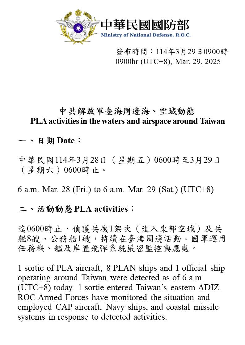 迄0600時止,偵獲共機1架次(進入東部空域)及共艦8艘、公務船1艘,持續在臺海周邊活動。國軍運用任務機、艦及岸置飛彈系統嚴密監控與應處。