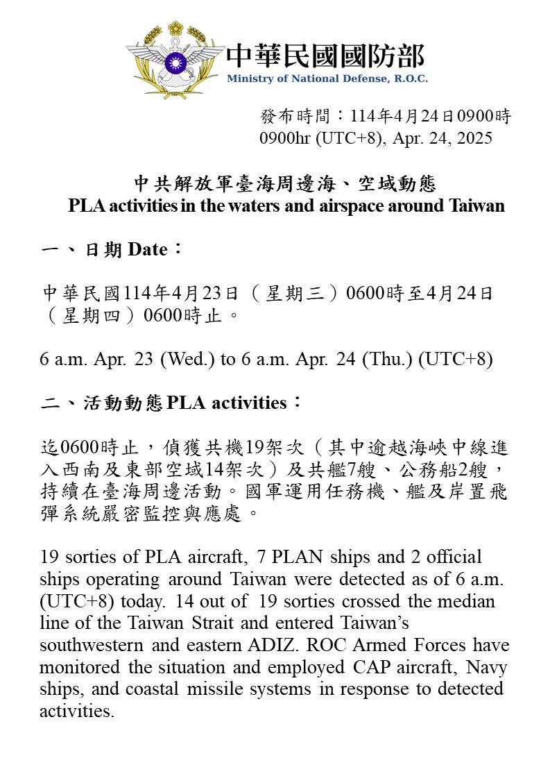 19 sorties of PLA aircraft, 7 PLAN ships and 2 official ships operating around Taiwan were detected as of 6 a.m. (UTC+8) today. 14 out of 19 sorties crossed the median line of the Taiwan Strait and entered Taiwan’s southwestern and eastern ADIZ. ROC Armed Forces have monitored the situation and employed CAP aircraft, Navy ships, and coastal missile systems in response to detected activities.
