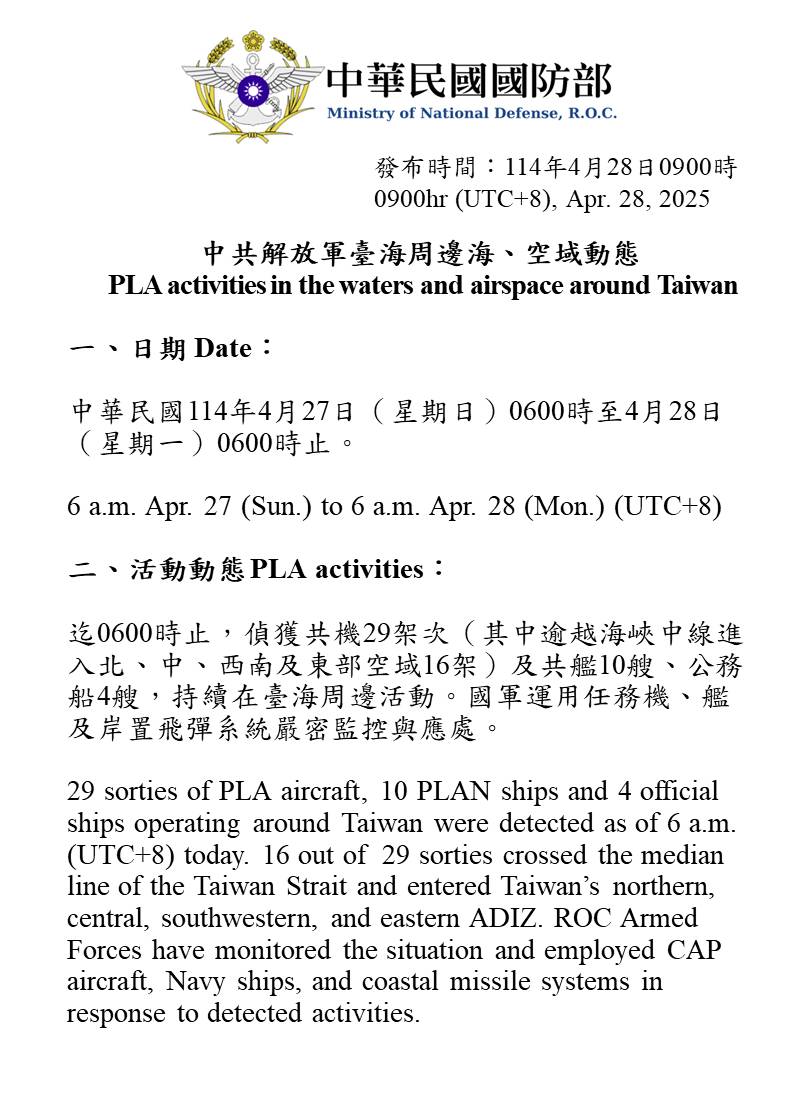 29 sorties of PLA aircraft, 10 PLAN ships and 4 official ships operating around Taiwan were detected as of 6 a.m. (UTC+8) today. 16 out of 29 sorties crossed the median line of the Taiwan Strait and entered Taiwan’s northern, central, southwestern, and eastern ADIZ. ROC Armed Forces have monitored the situation and employed CAP aircraft, Navy ships, and coastal missile systems in response to detected activities.
