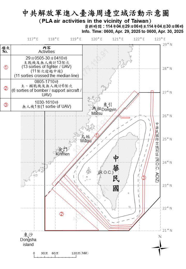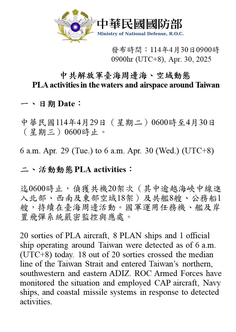 20 sorties of PLA aircraft, 8 PLAN ships and 1 official ship operating around Taiwan were detected as of 6 a.m. (UTC+8) today. 18 out of 20 sorties crossed the median line of the Taiwan Strait and entered Taiwan’s northern, southwestern and eastern ADIZ. ROC Armed Forces have monitored the situation and employed CAP aircraft, Navy ships, and coastal missile systems in response to detected activities.