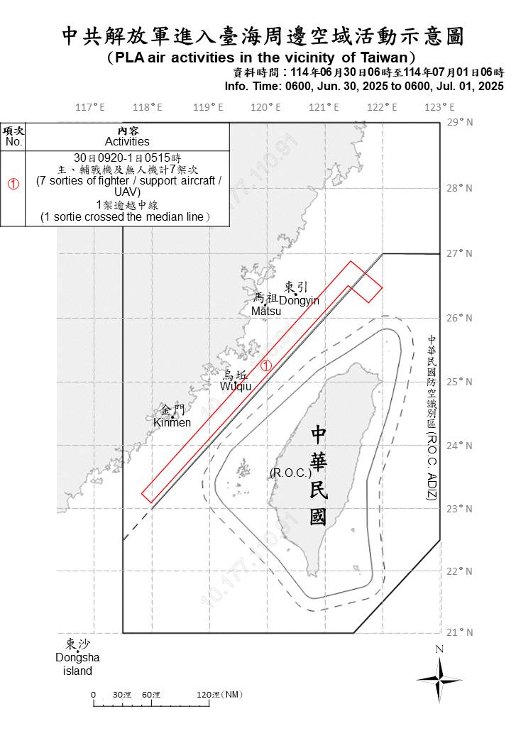 7 sorties of PLA aircraft and 9 PLAN ships operating around Taiwan were detected as of 6 a.m. (UTC+8) today. 1 out of 7 sorties crossed the median line of the Taiwan Strait and entered Taiwan’s northern ADIZ. ROC Armed Forces have monitored the situation and employed CAP aircraft, Navy ships, and coastal missile systems in response to detected activities.